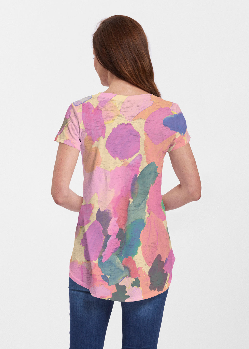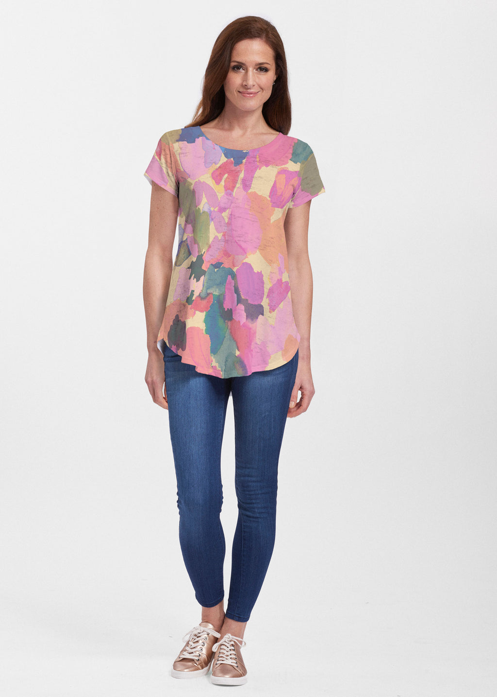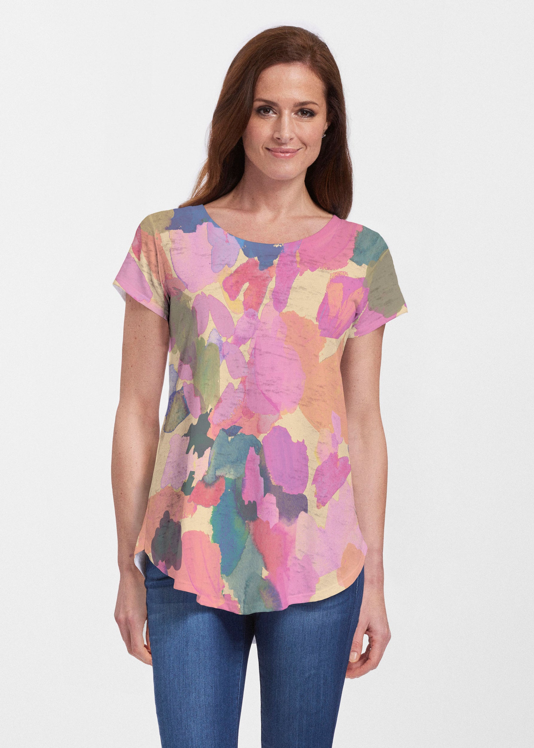 An effortlessly flattering tunic in our soft Signature burnout fabric featuring short sleeves and a scoop neck with a body that flows into a full, swinging shirttail hem.