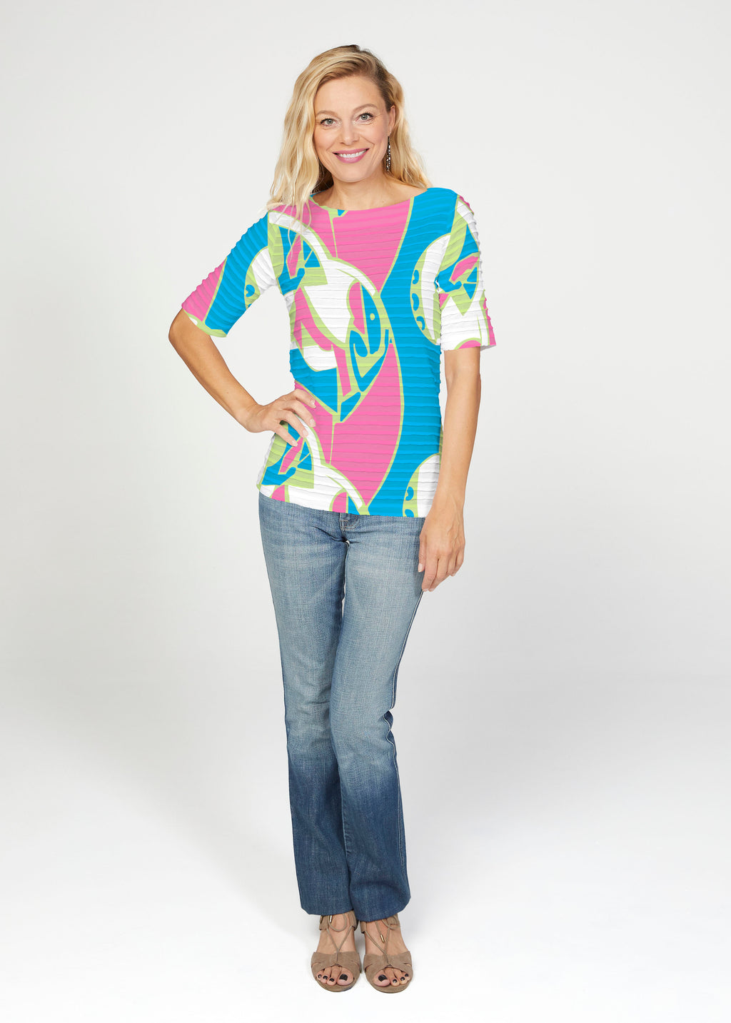 The uniquely soft, pleated texture in this Banded fabric gives the elbow sleeve and boat neck top a fun and sophisticated look. Easy relaxed fit with a hemline that comes below the hip.