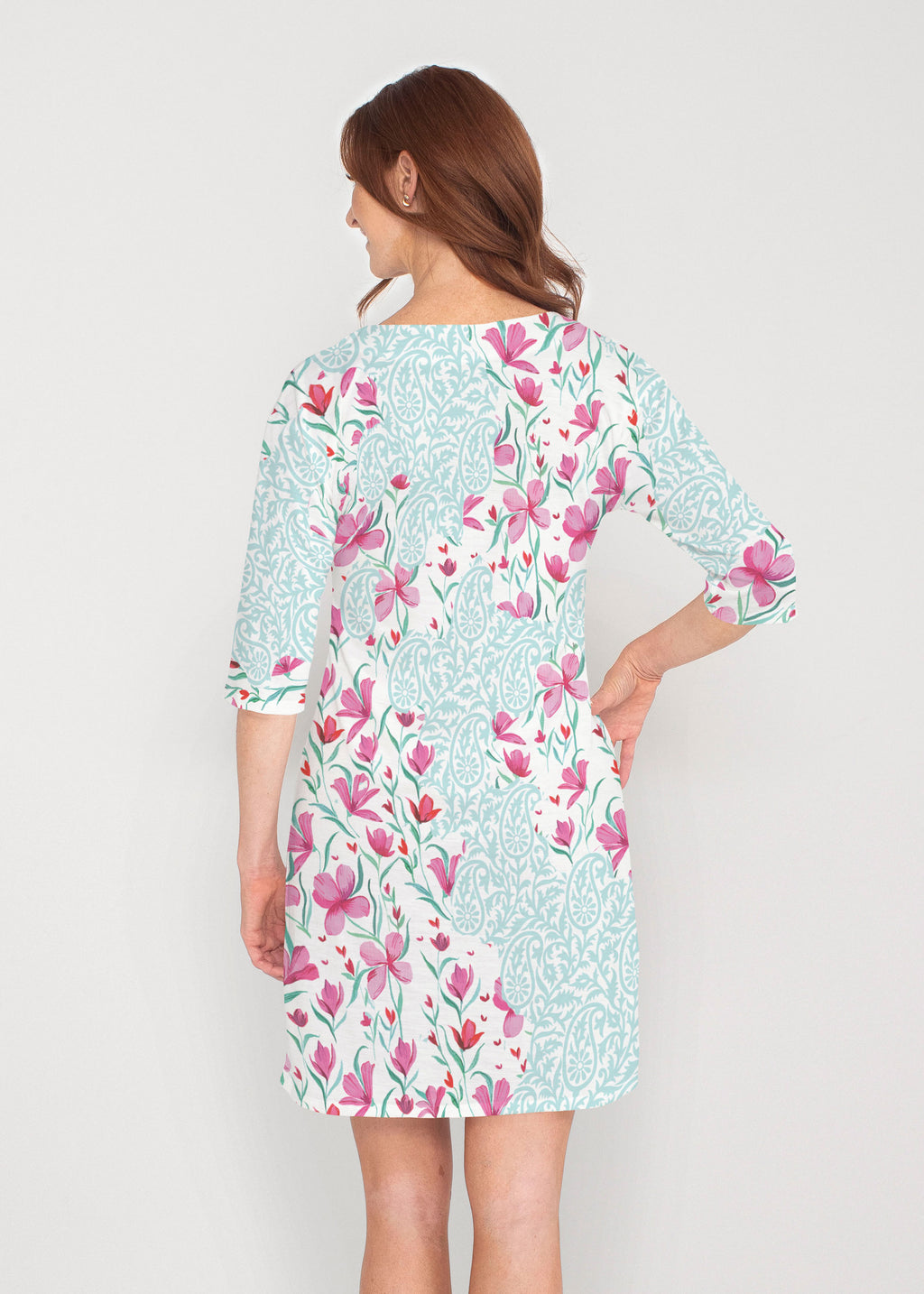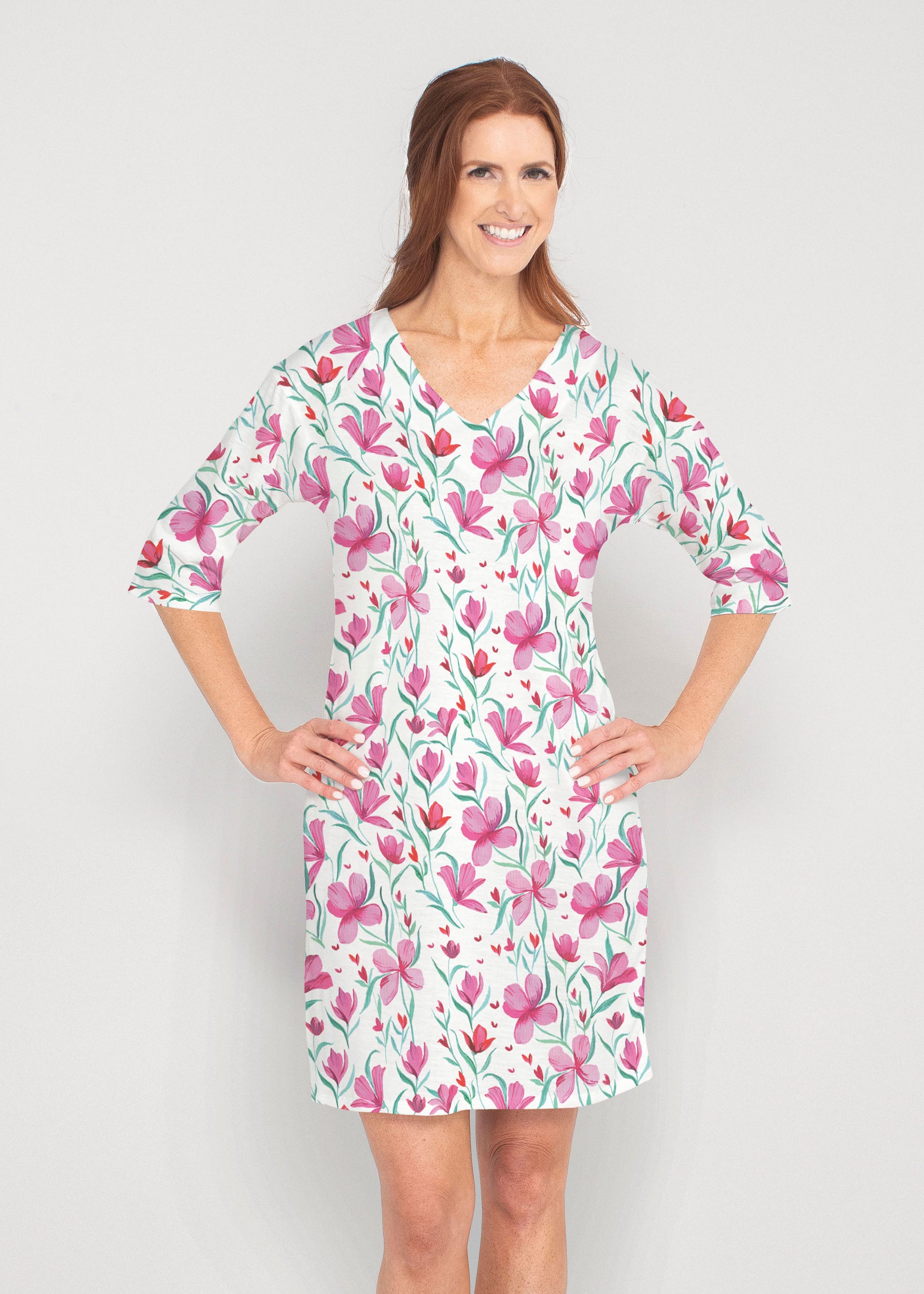 Be comfortable and fashionable all day in our soft Lucy fabric. This v-neck dress features loose 3/4 sleeves, drop shoulders and falls just at the knee.
