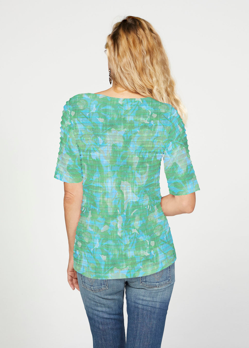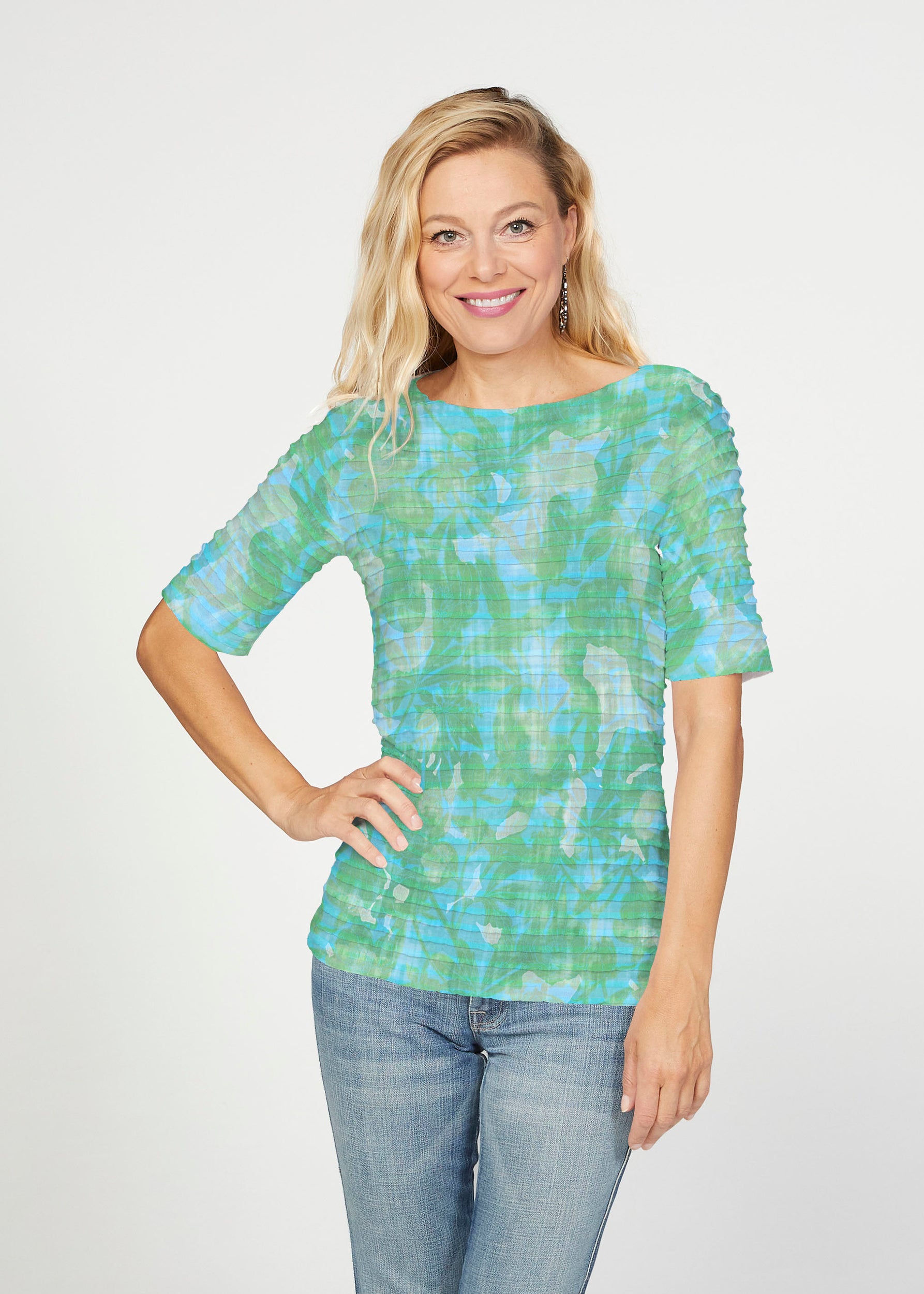 The uniquely soft, pleated texture in this Banded fabric gives the elbow sleeve and boat neck top a fun and sophisticated look. Easy relaxed fit with a hemline that comes below the hip.