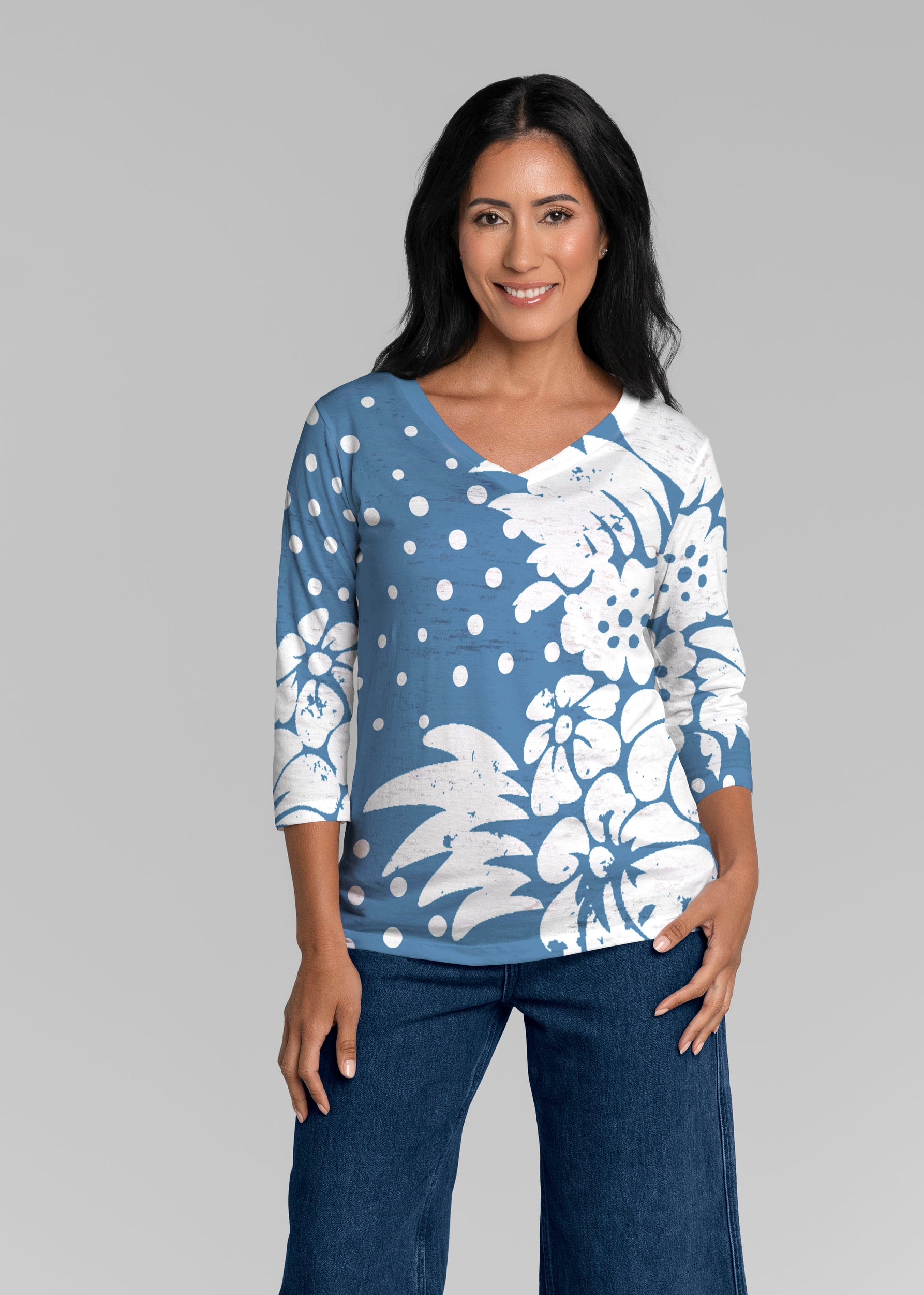 Our casual Signature 3/4 sleeve has a subtle v-neck and is perfectly proportioned and a new best-selling favorite. This relaxed fit is not only flattering but you get to pick that special print for any mood.