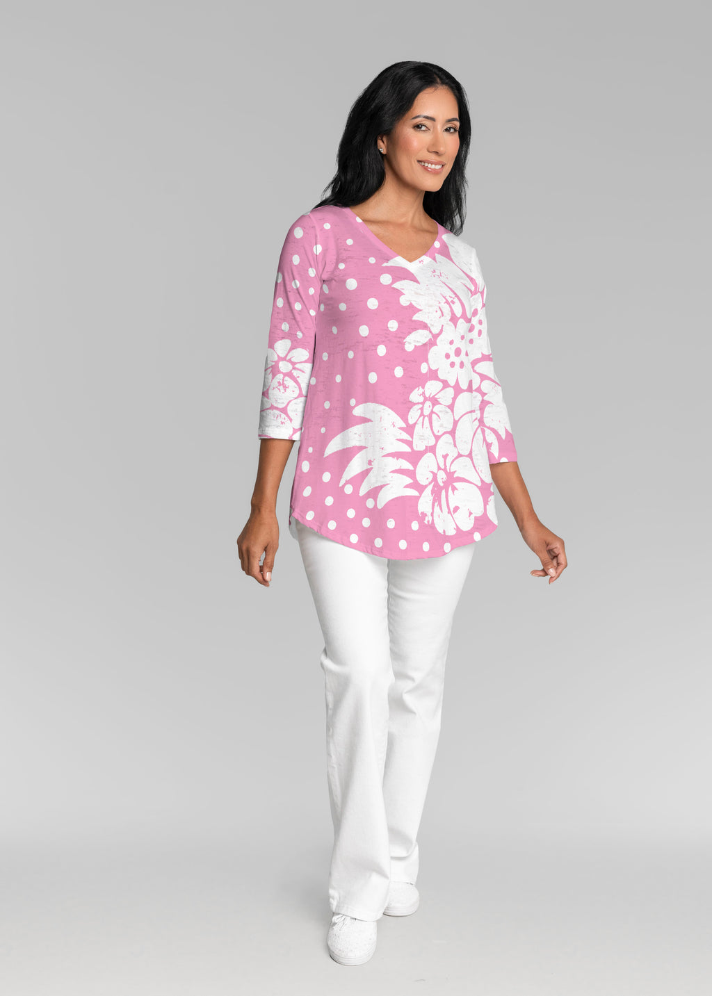 This v-neck tunic in our Signature burnout fabric is forever flattering. 3/4 sleeves and a v-neck flow into a full, swinging shirttail hem.