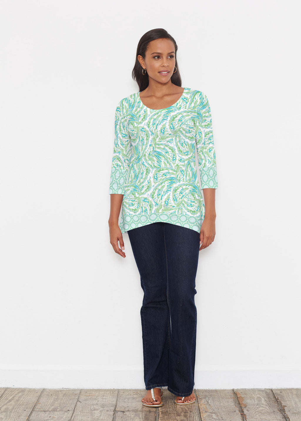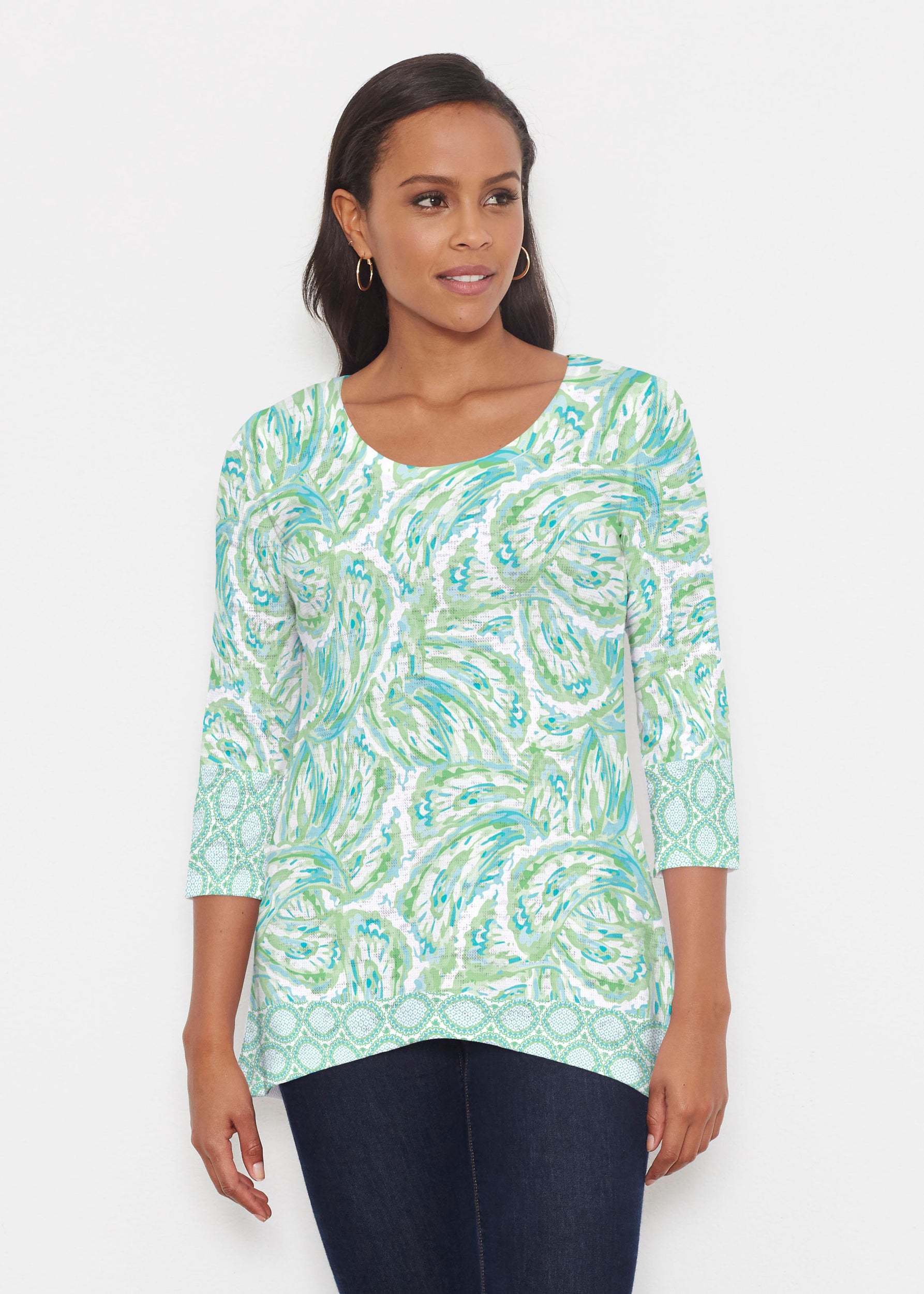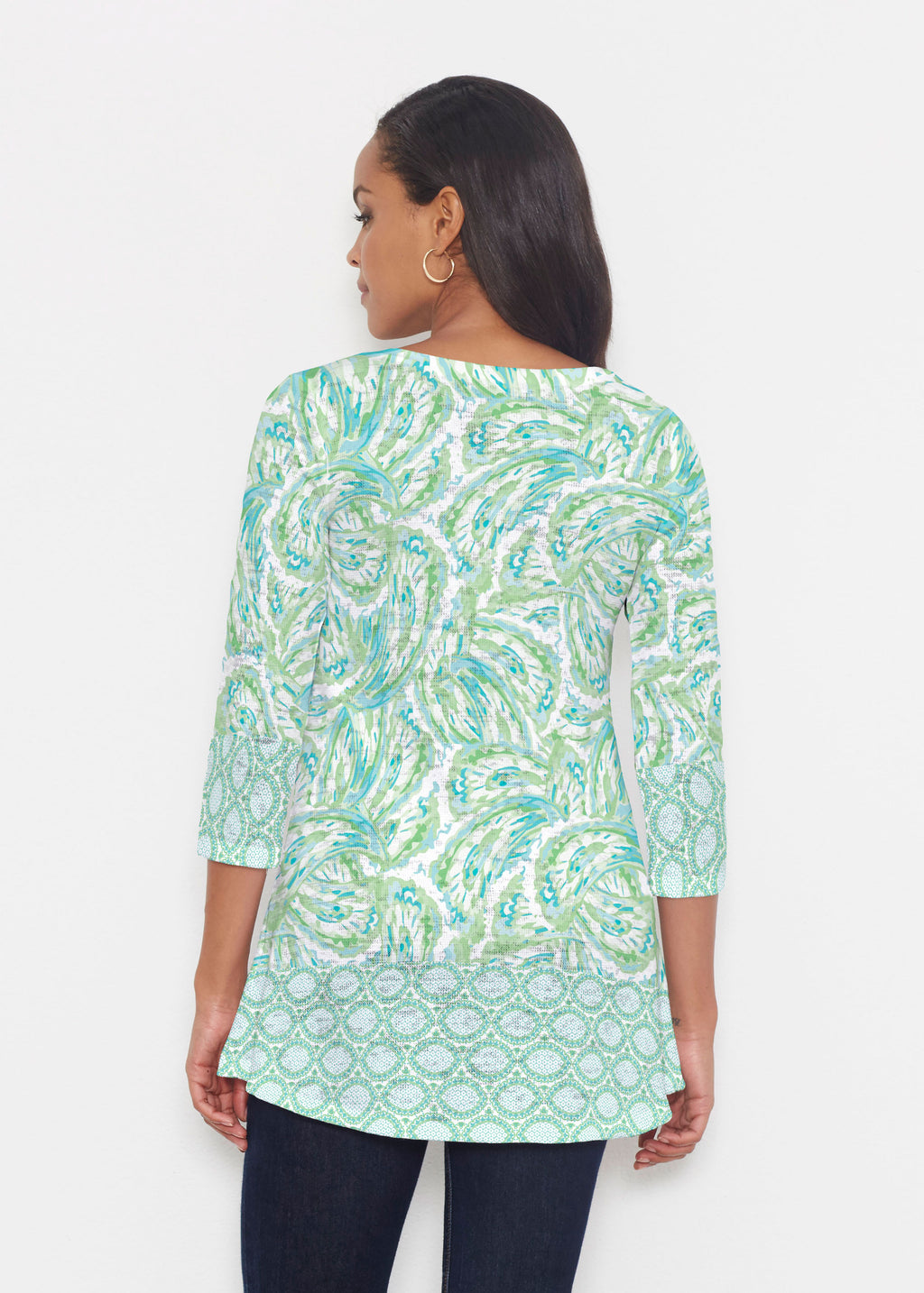 A fanciful paisley prints in coastal colors of green and blue with contrasting hem and cuffs. Designed by Susan Werner.