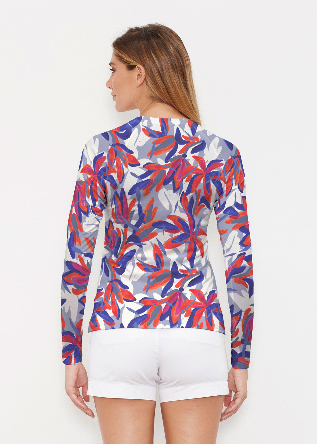 Our WHIMSY ROSE™ Safe Sun UPF 50+ long sleeve, crew neck rash guard offers versatile, beach-to-bistro style, supreme comfort, and an activewear fit. Made in a specially designed Safe Sun textile that blocks more harmful rays and provides a smart solution for those who love to swim, surf, kayak, canoe, waterski, boat, or simply relax waterside.
