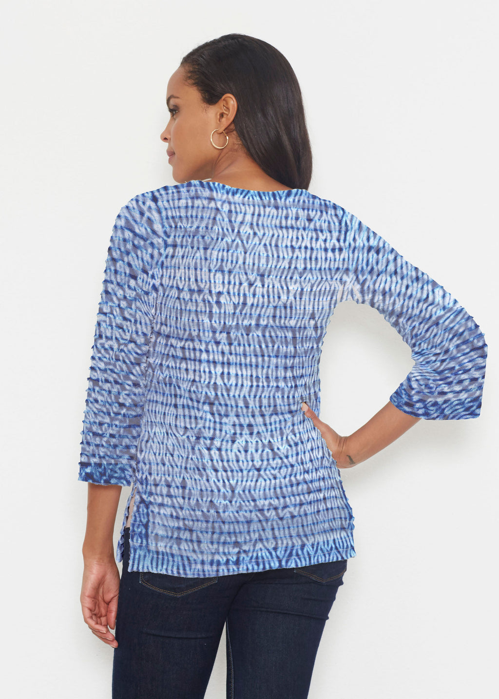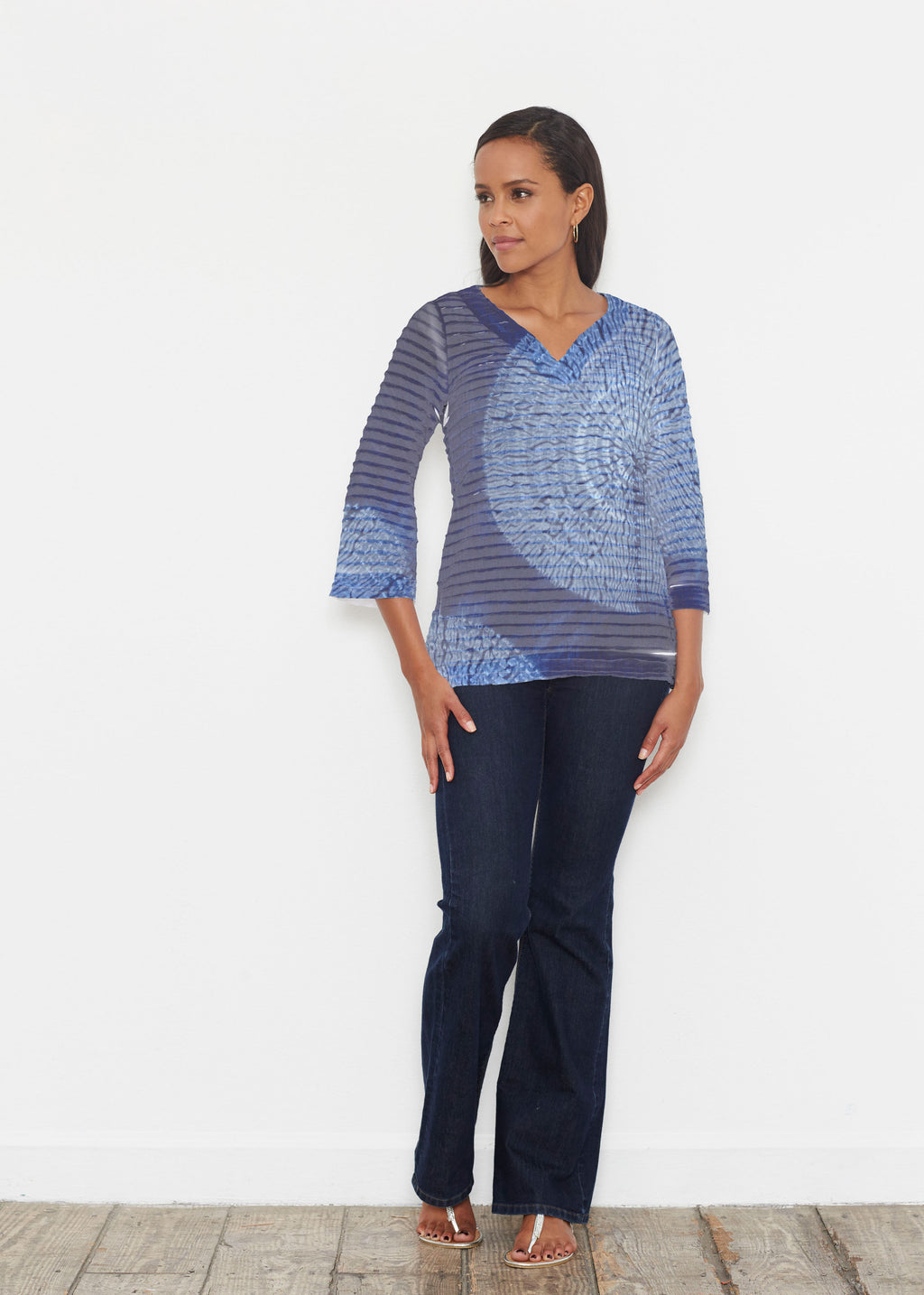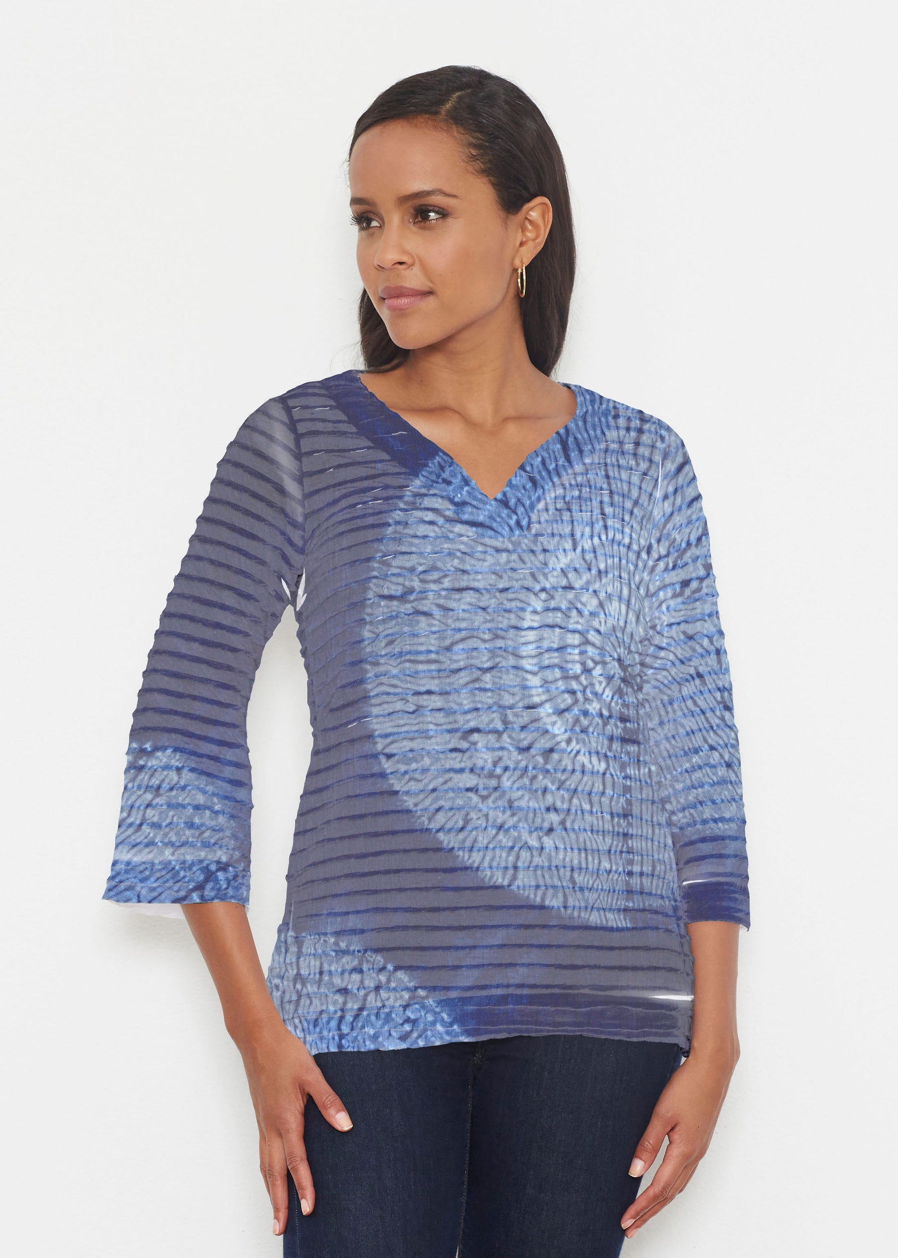 The uniquely soft, pleated texture in this Banded fabric give the 3/4 bell sleeves and sweetheart v-neck a fun and sophisticated look. Flattering side vents adorn the hemline that skims the hip.