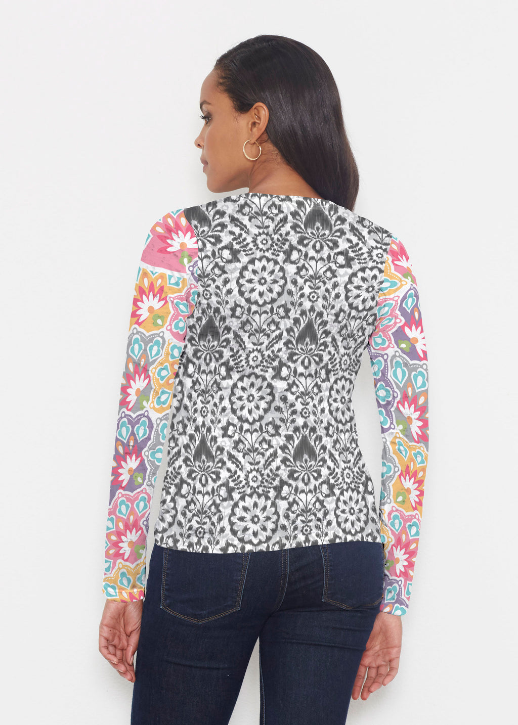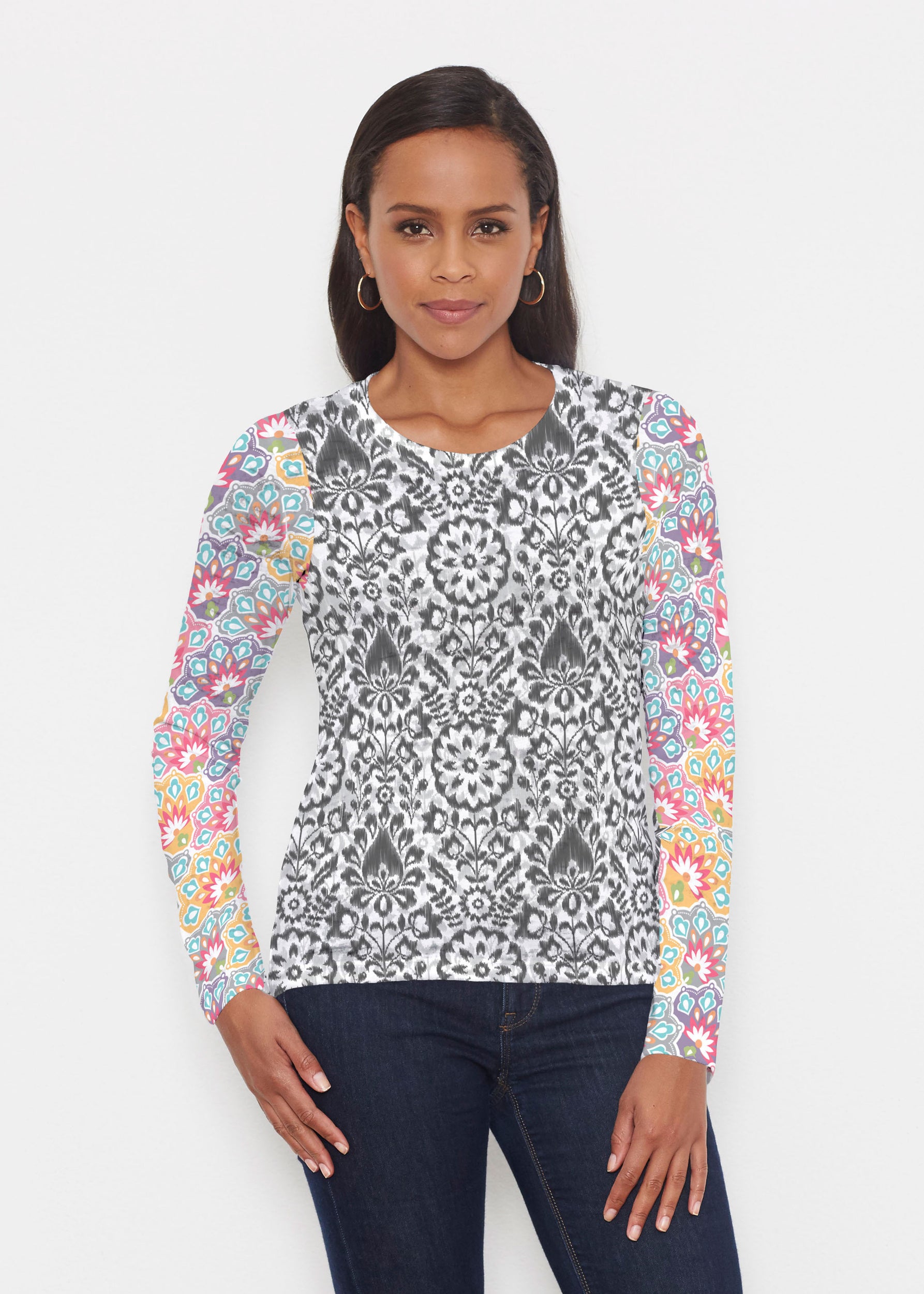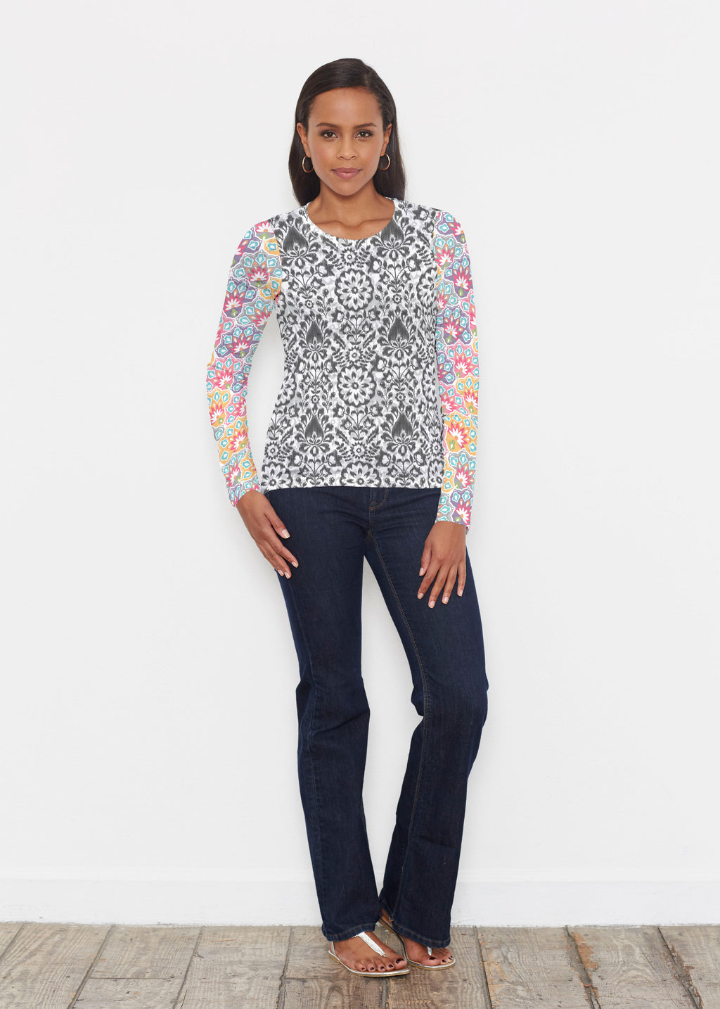 Whimsy print in black and white with bold floral contrasting sleeves in pink, purple, yellow and aqua – a design collaboration of Whimsy Rose and Diane Kappa. This print is a limited release and only available on our long sleeve tops.