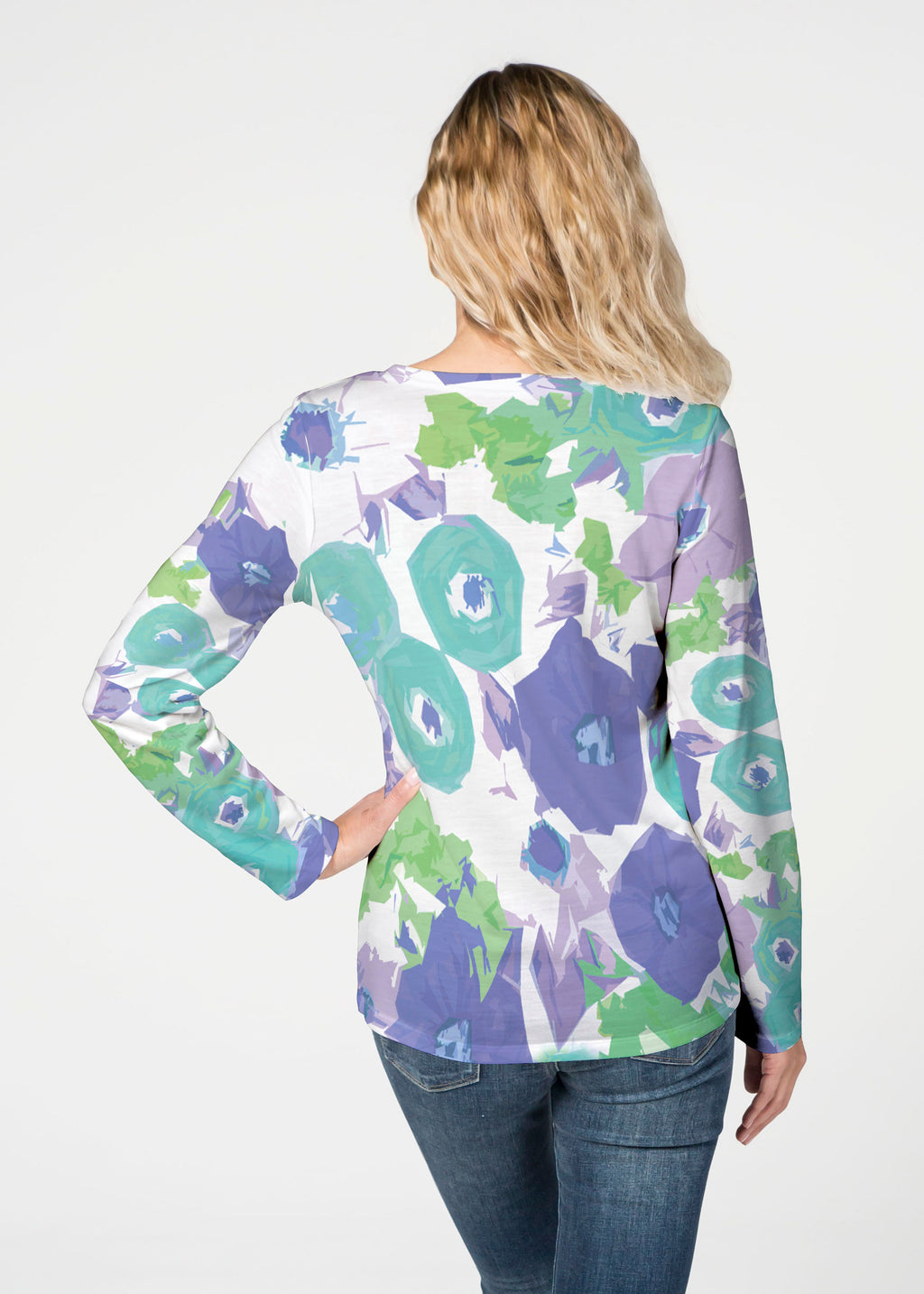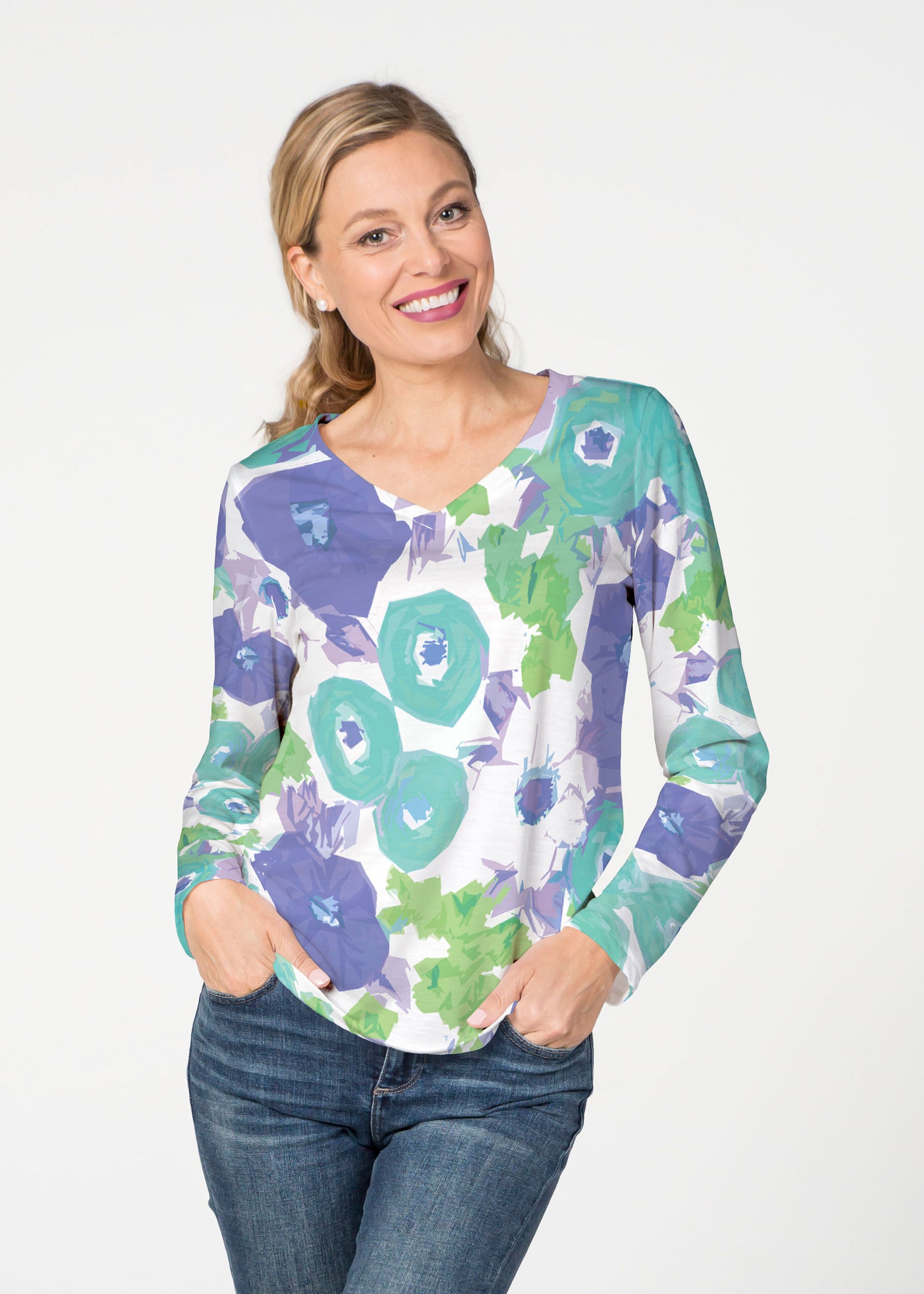 Our French Terry top is comfort and style all in one! Our French Terry top that features long sleeves, a V-neck and a more fitted silhouette that looks stylish in any print.