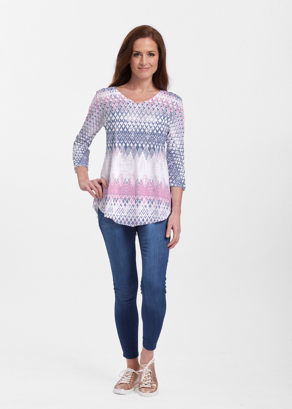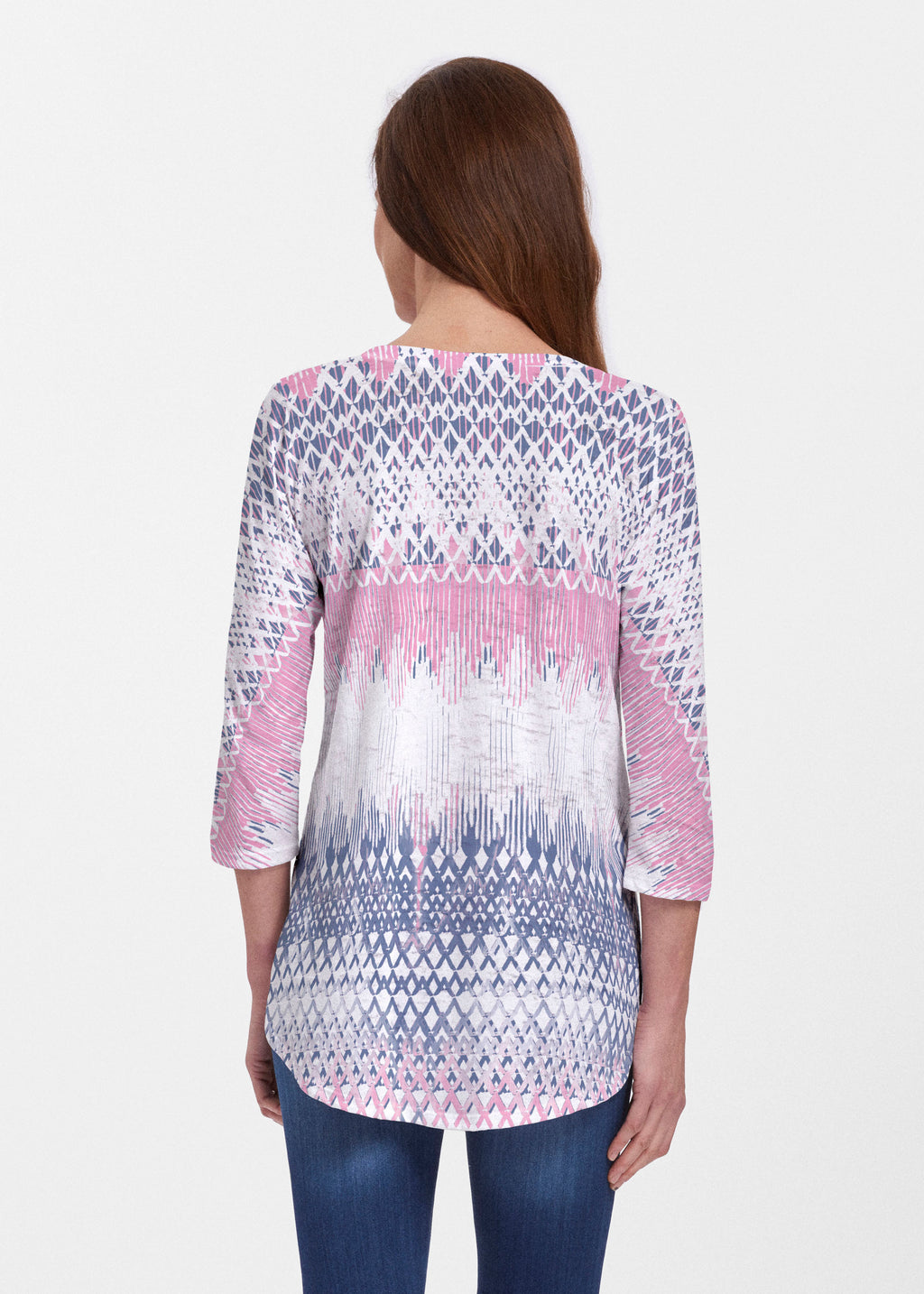 This v-neck tunic in our Signature burnout fabric is forever flattering. 3/4 sleeves and a v-neck flow into a full, swinging shirttail hem.