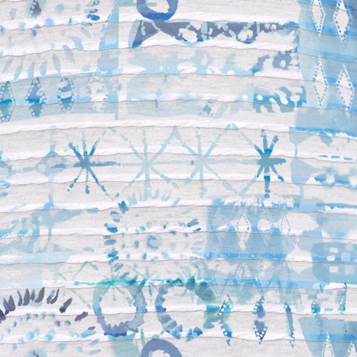 A whimsical geometric print in different hues of blue and white designed by Sara Berrenson.