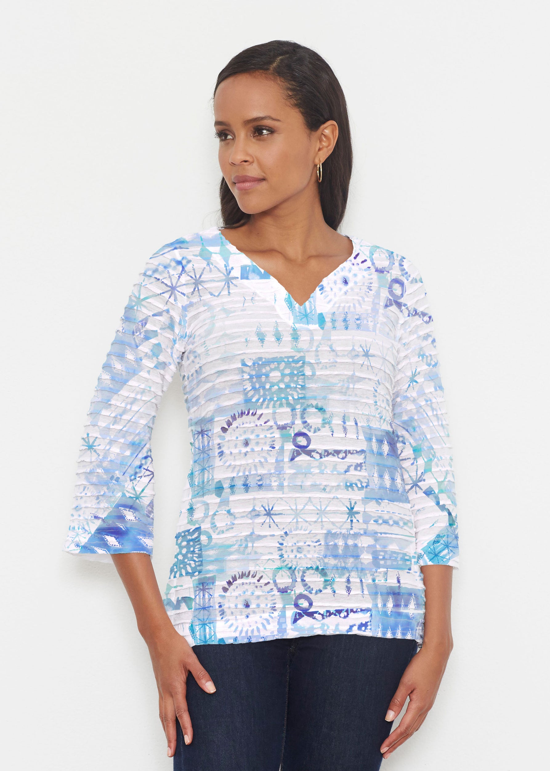 The uniquely soft, pleated texture in this Banded fabric give the 3/4 bell sleeves and sweetheart v-neck a fun and sophisticated look. Flattering side vents adorn the hemline that skims the hip.