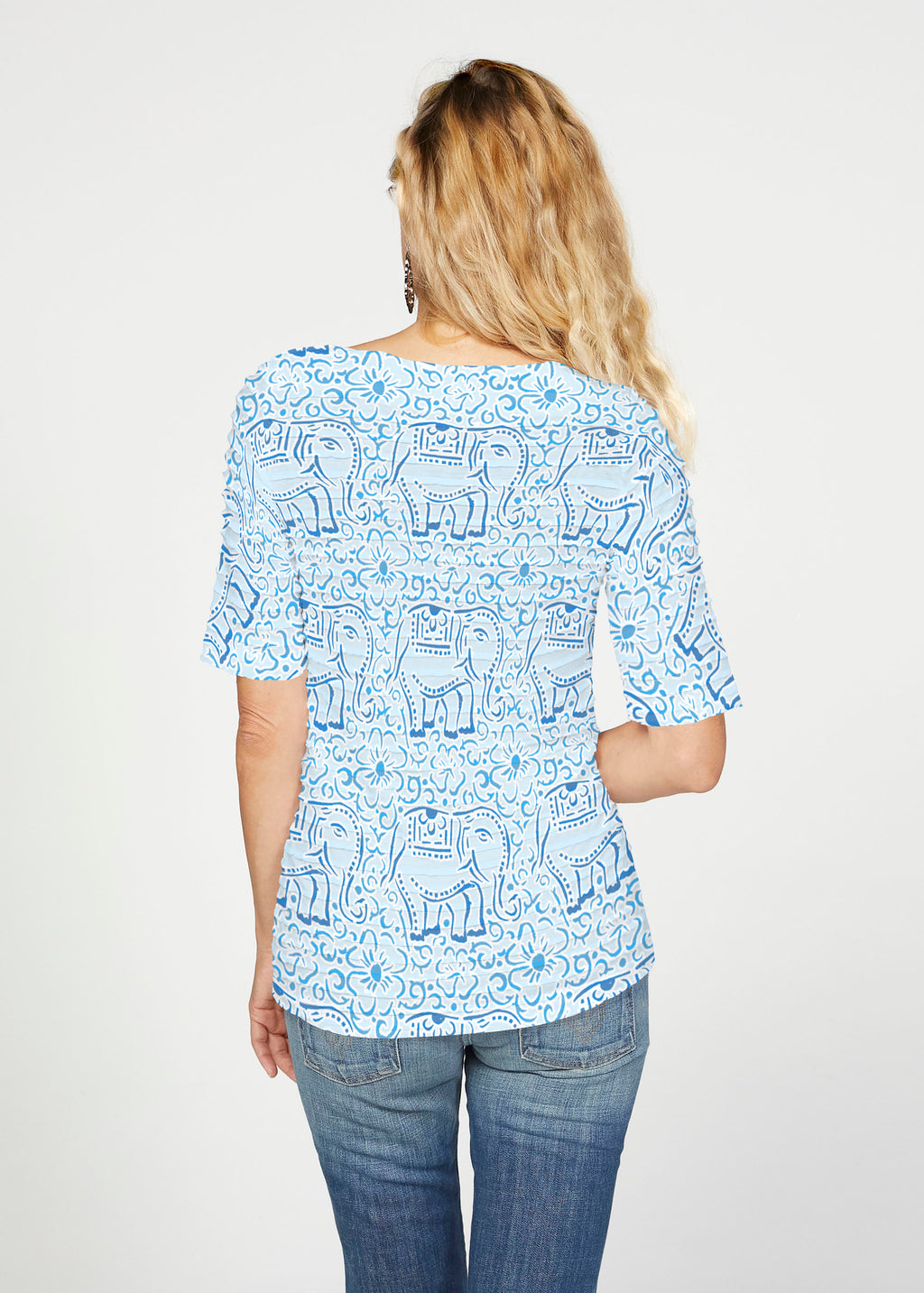 The uniquely soft, pleated texture in this Banded fabric gives the elbow sleeve and boat neck top a fun and sophisticated look. Easy relaxed fit with a hemline that comes below the hip.