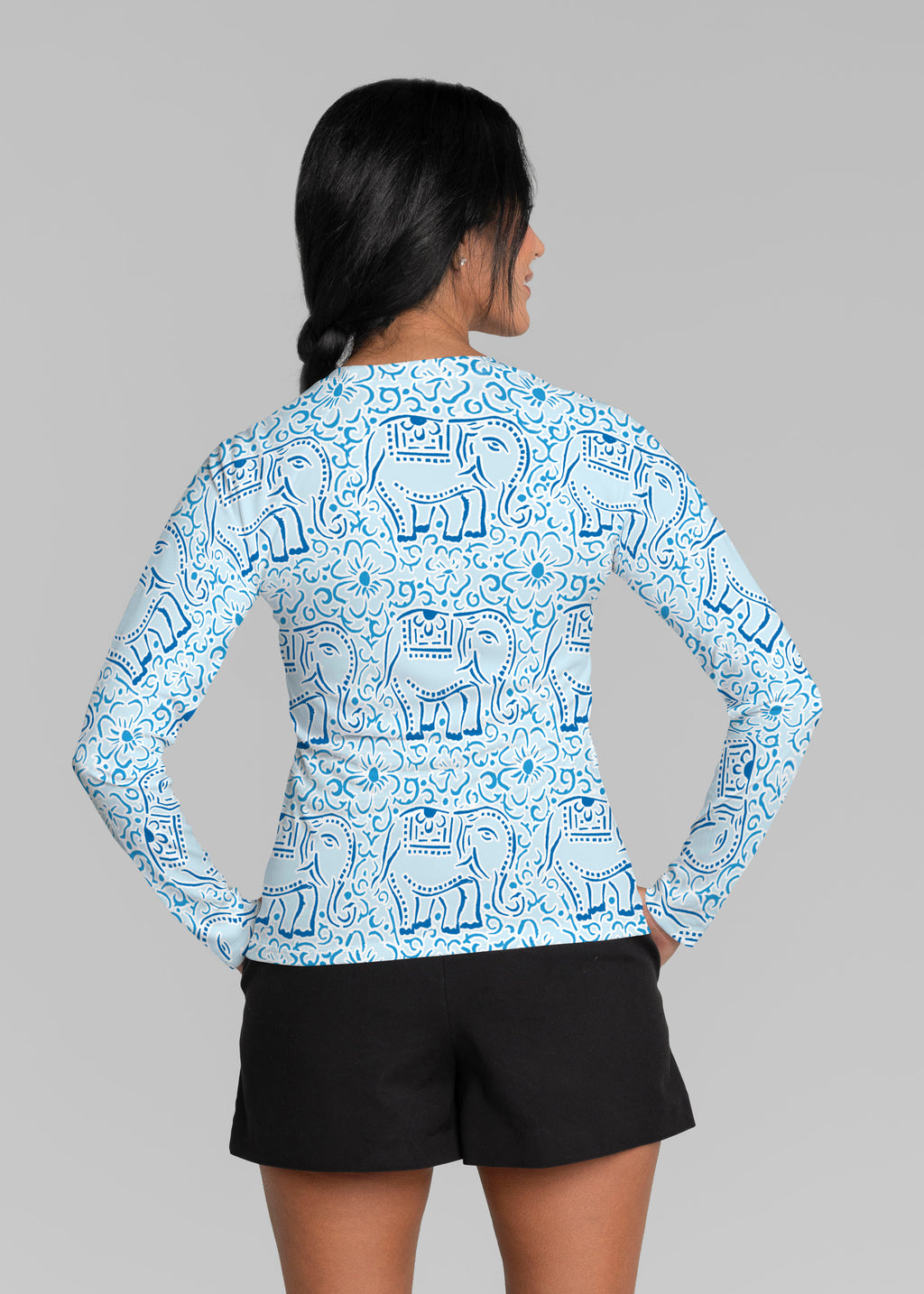 Our WHIMSY ROSE™ Safe Sun UPF 50+ long sleeve, crew neck rash guard offers versatile, beach-to-bistro style, supreme comfort, and an activewear fit. Made in a specially designed Safe Sun textile that blocks more harmful rays and provides a smart solution for those who love to swim, surf, kayak, canoe, waterski, boat, or simply relax waterside.