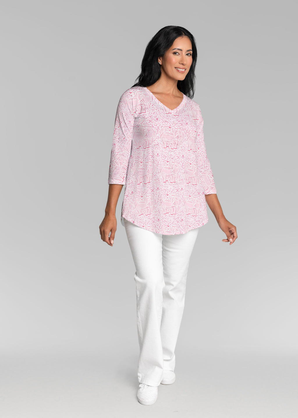 This v-neck tunic in our Signature burnout fabric is forever flattering. 3/4 sleeves and a v-neck flow into a full, swinging shirttail hem.