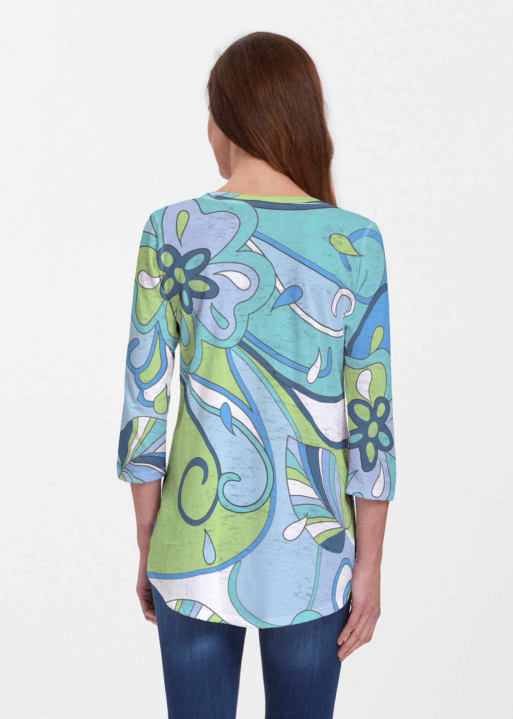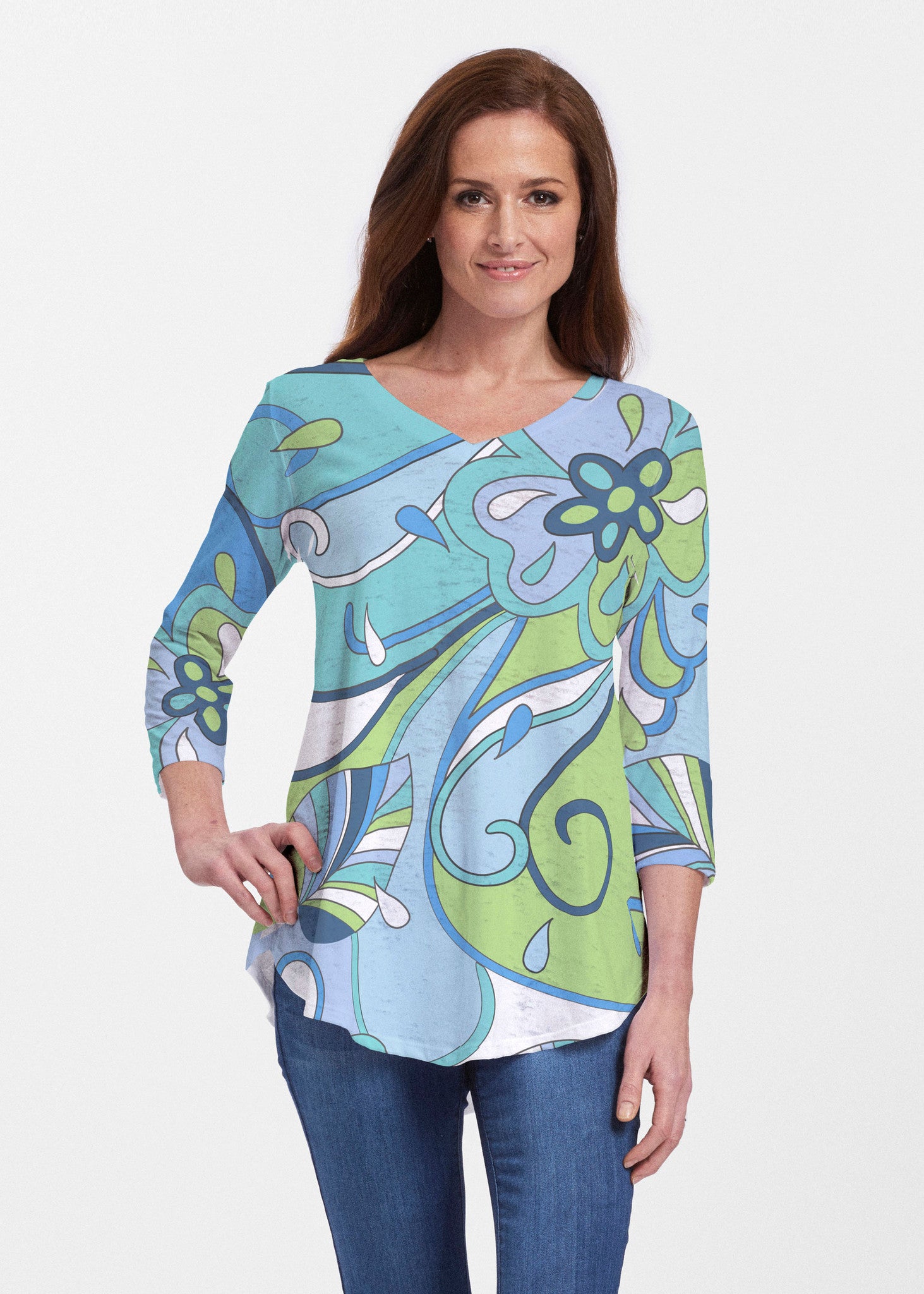 This v-neck tunic in our Signature burnout fabric is forever flattering. 3/4 sleeves and a v-neck flow into a full, swinging shirttail hem.