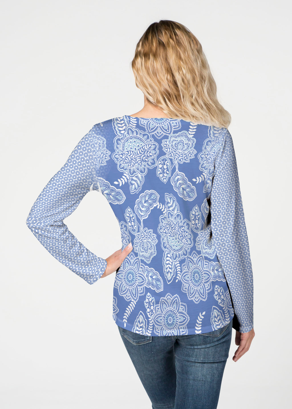 A beautiful print with blooming florals and detailed vines with contrasting print on the sleeves designed by Diane Kappa.