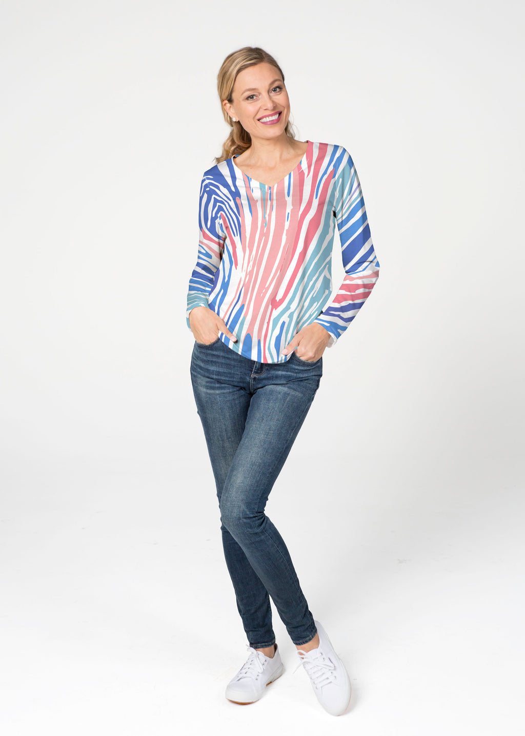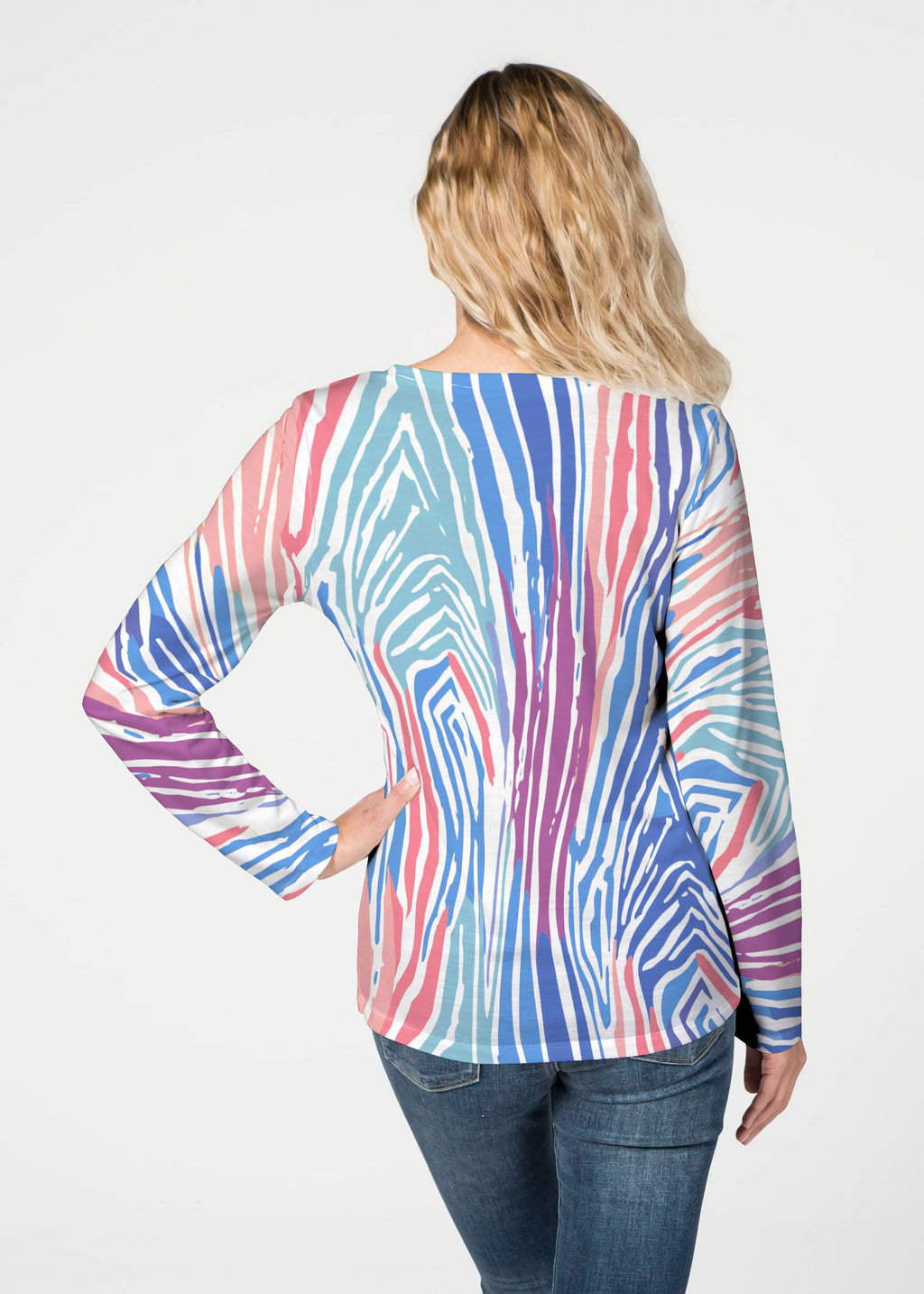 Our French Terry top is comfort and style all in one! Our French Terry top that features long sleeves, a V-neck and a more fitted silhouette that looks stylish in any print.