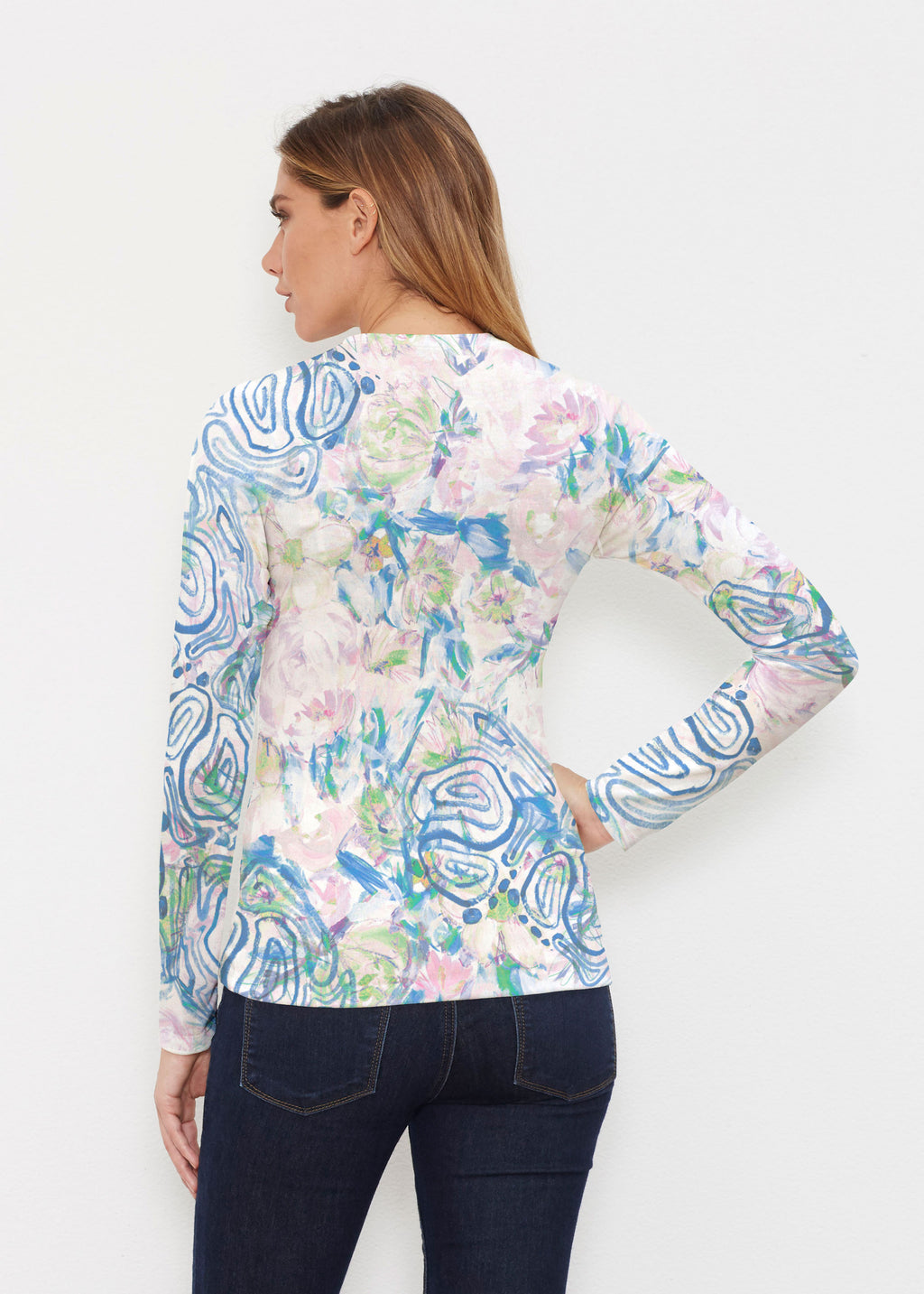 A soft watercolor of turquoise, pink and greens with a splash of whimsical on the sleeves and back.