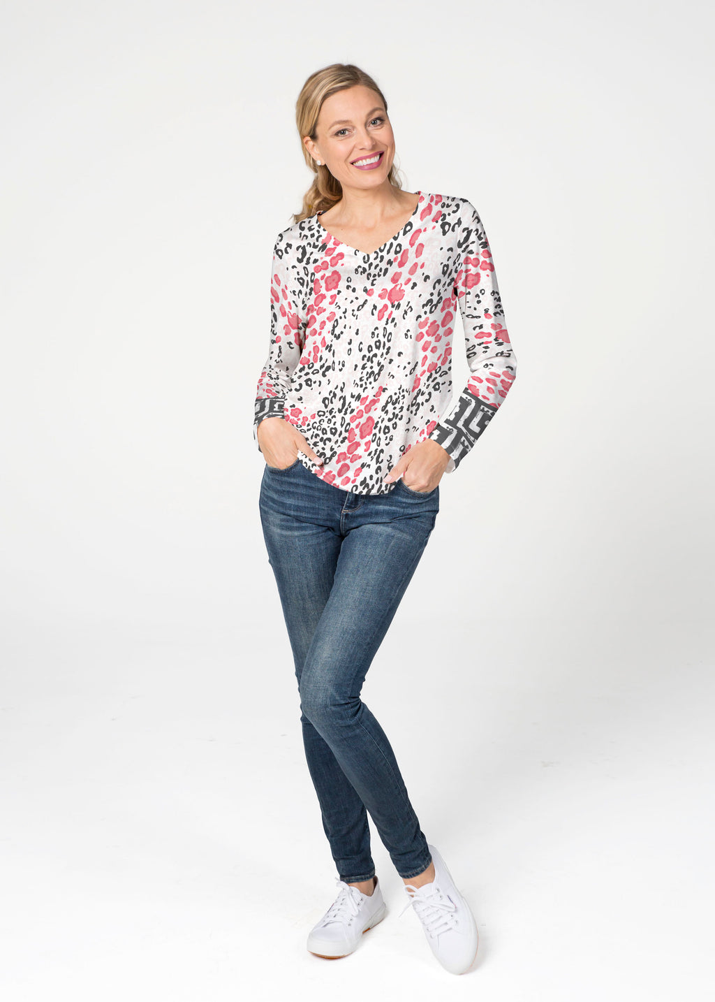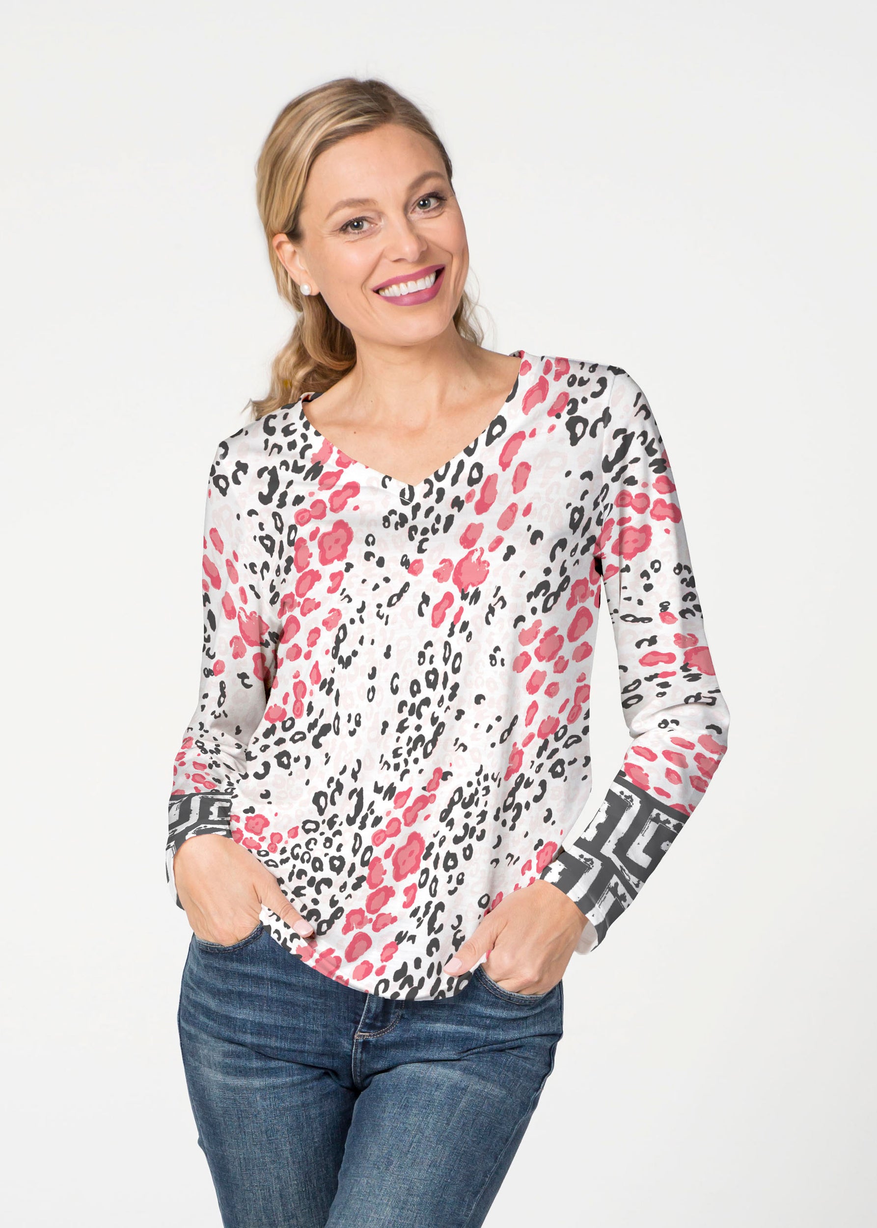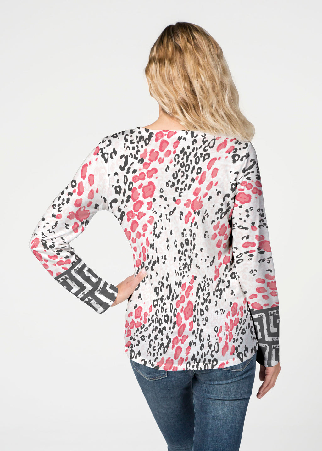 A fun yet sophisticated mixed print with bands of abstract leopard spots in pink, red, black and white with a classic Greek Key pattern on the sleeve ends. Designed by Susan Werner.