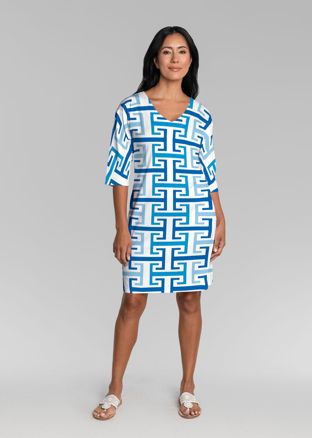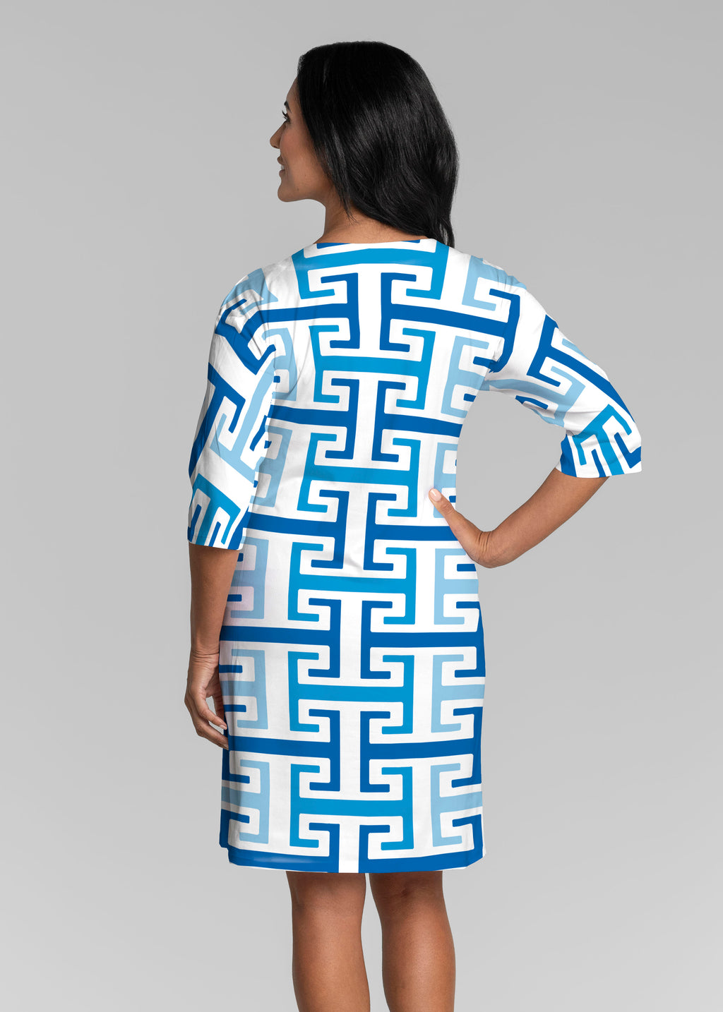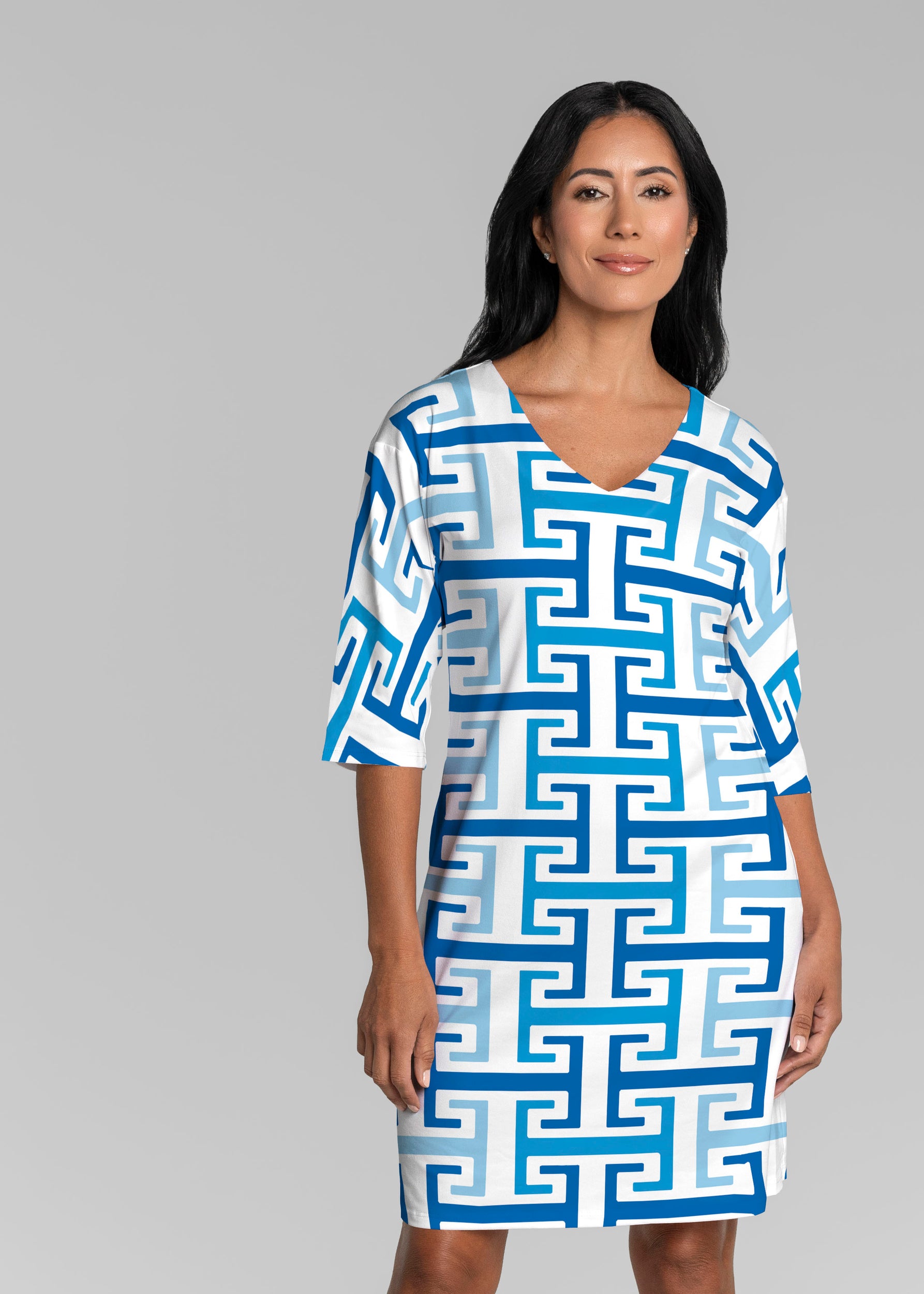 Greek Key Blue (8192) ~ Lucy 3/4 Sleeve V-Neck Dress