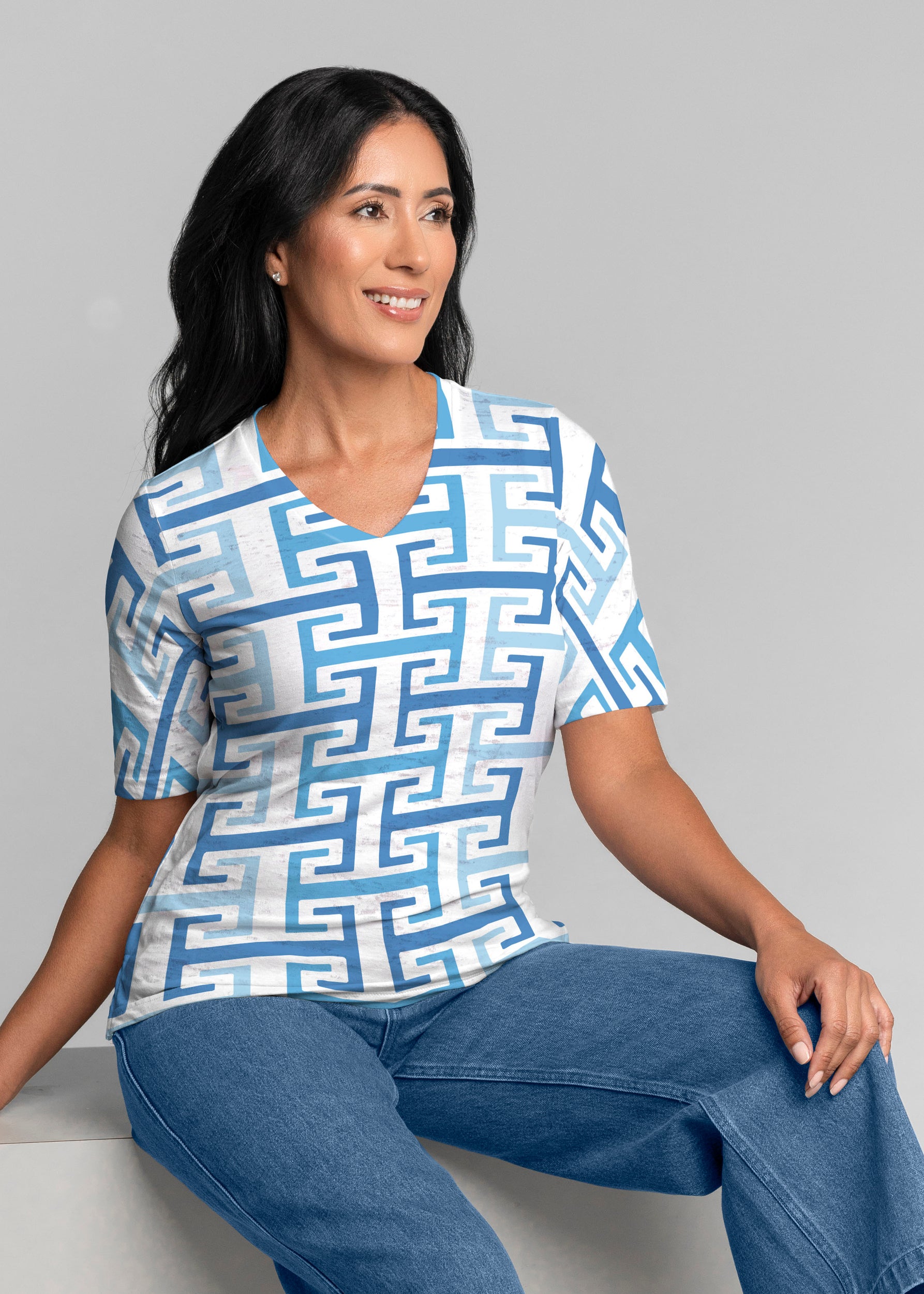 Greek Key Blue (8192) ~ Signature Cap Sleeve V-Neck Shirt