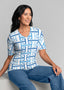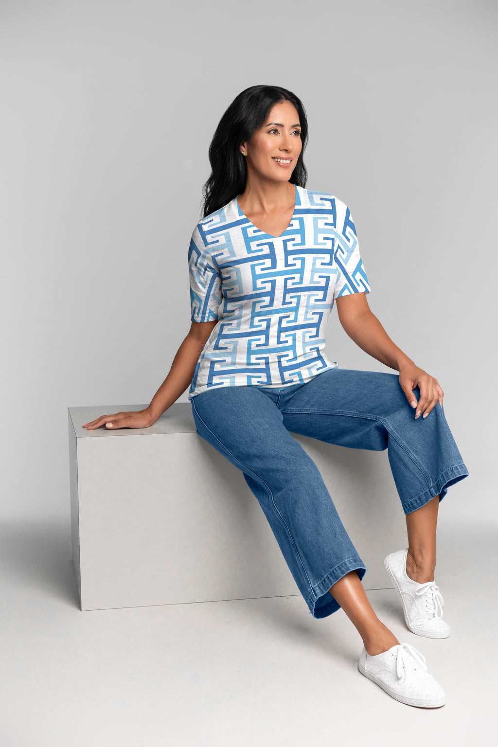 Greek Key Blue (8192) ~ Signature Elbow Sleeve V-Neck Top