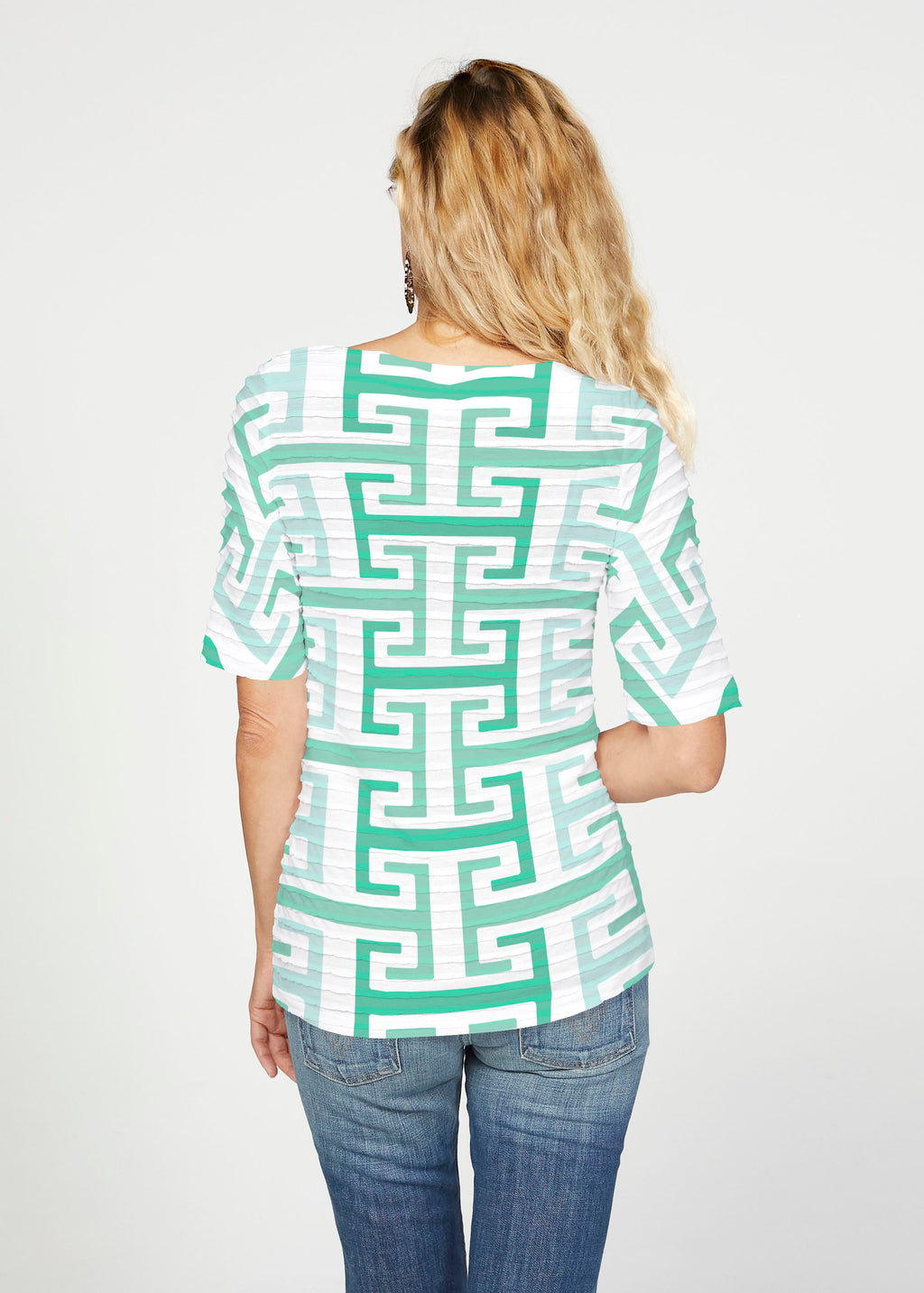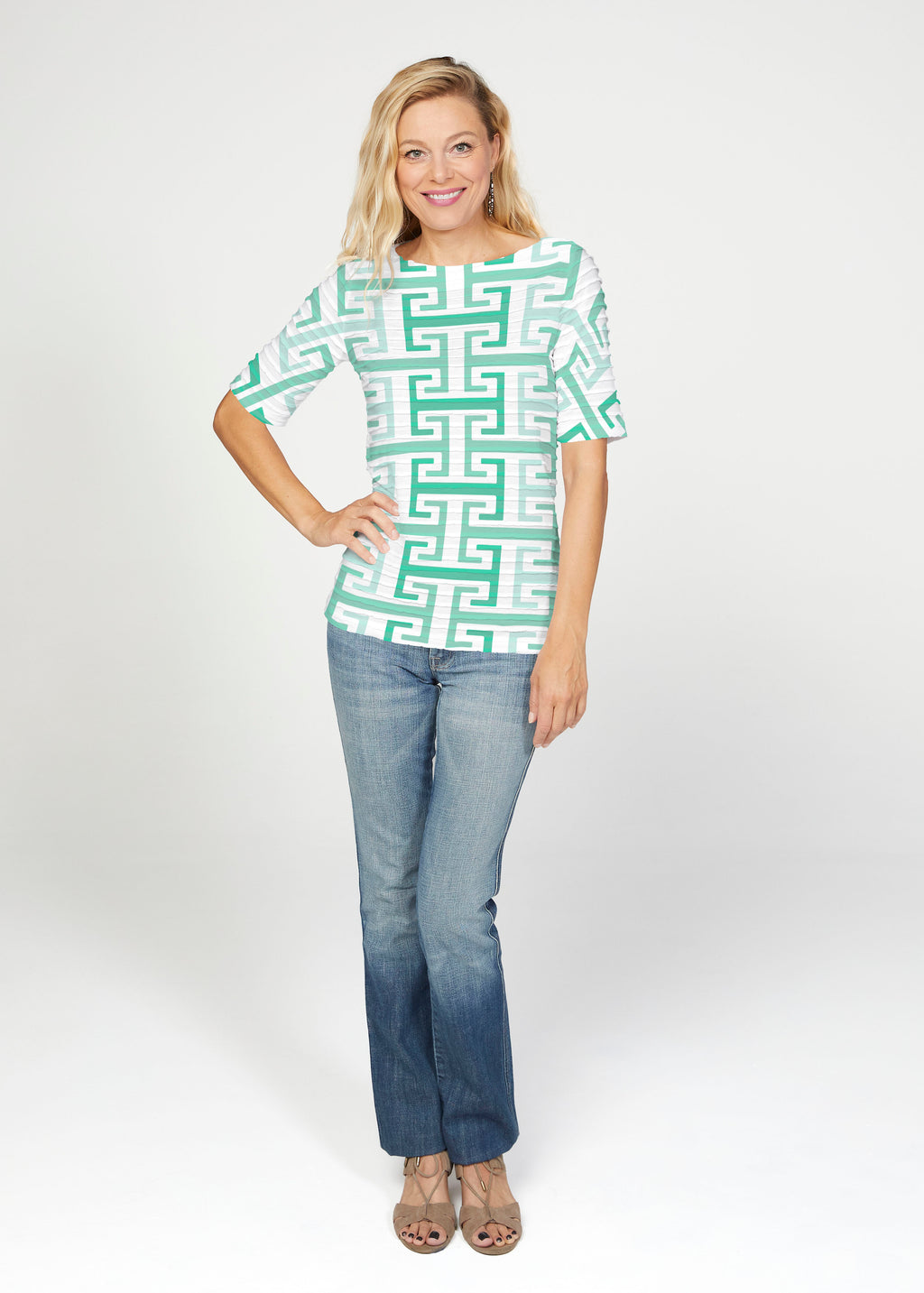 Greek Key Mint (8193) ~ Banded Elbow Sleeve Boat Neck Top