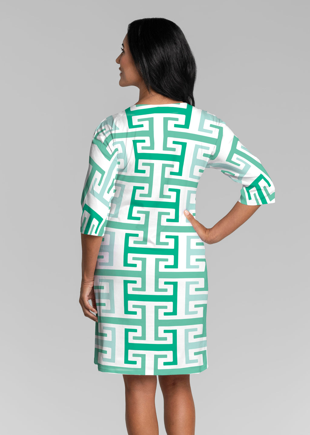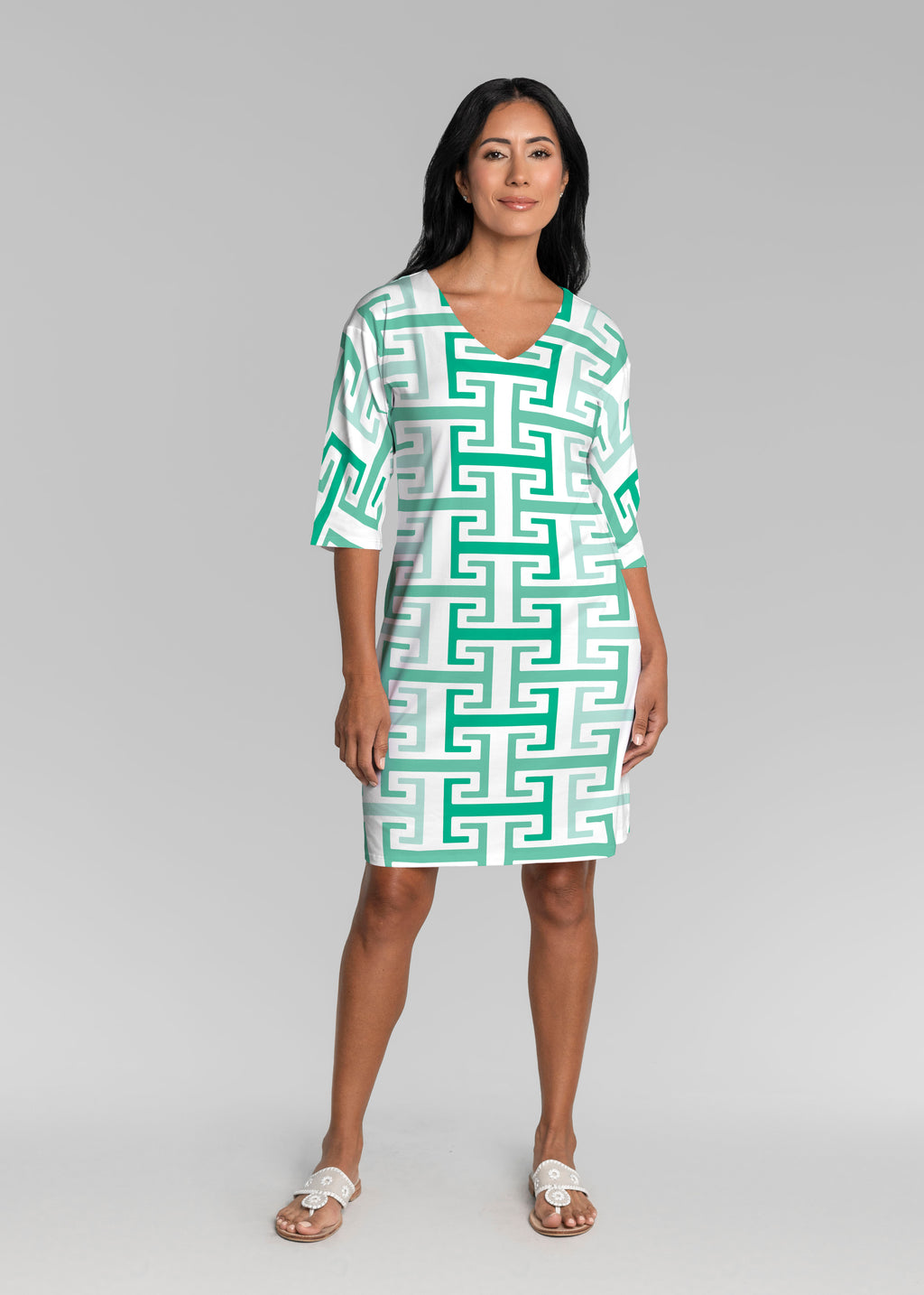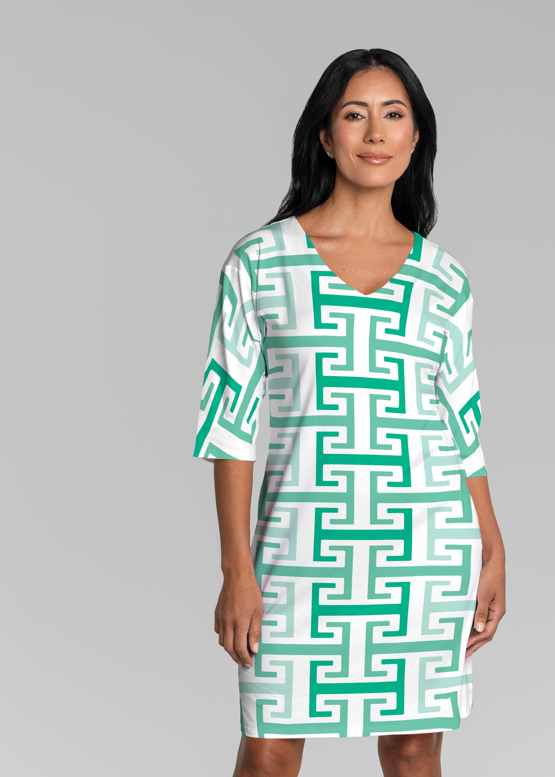 • Greek Key Mint (8193) ~ Lucy 3/4 Sleeve V-Neck Dress