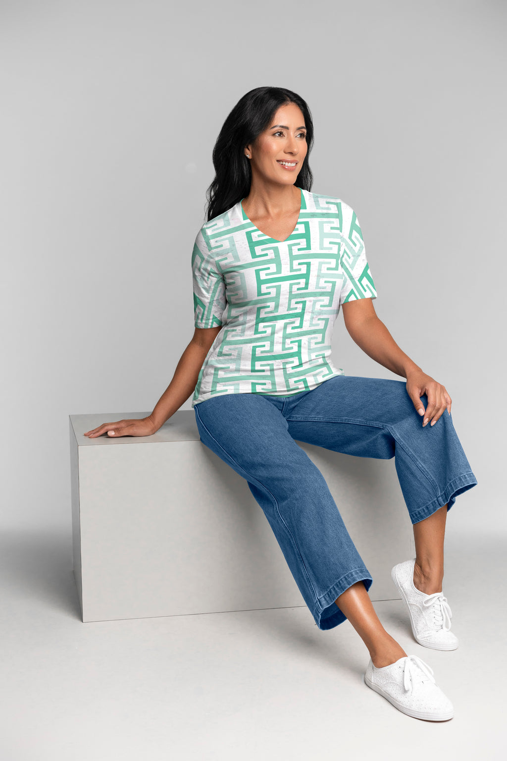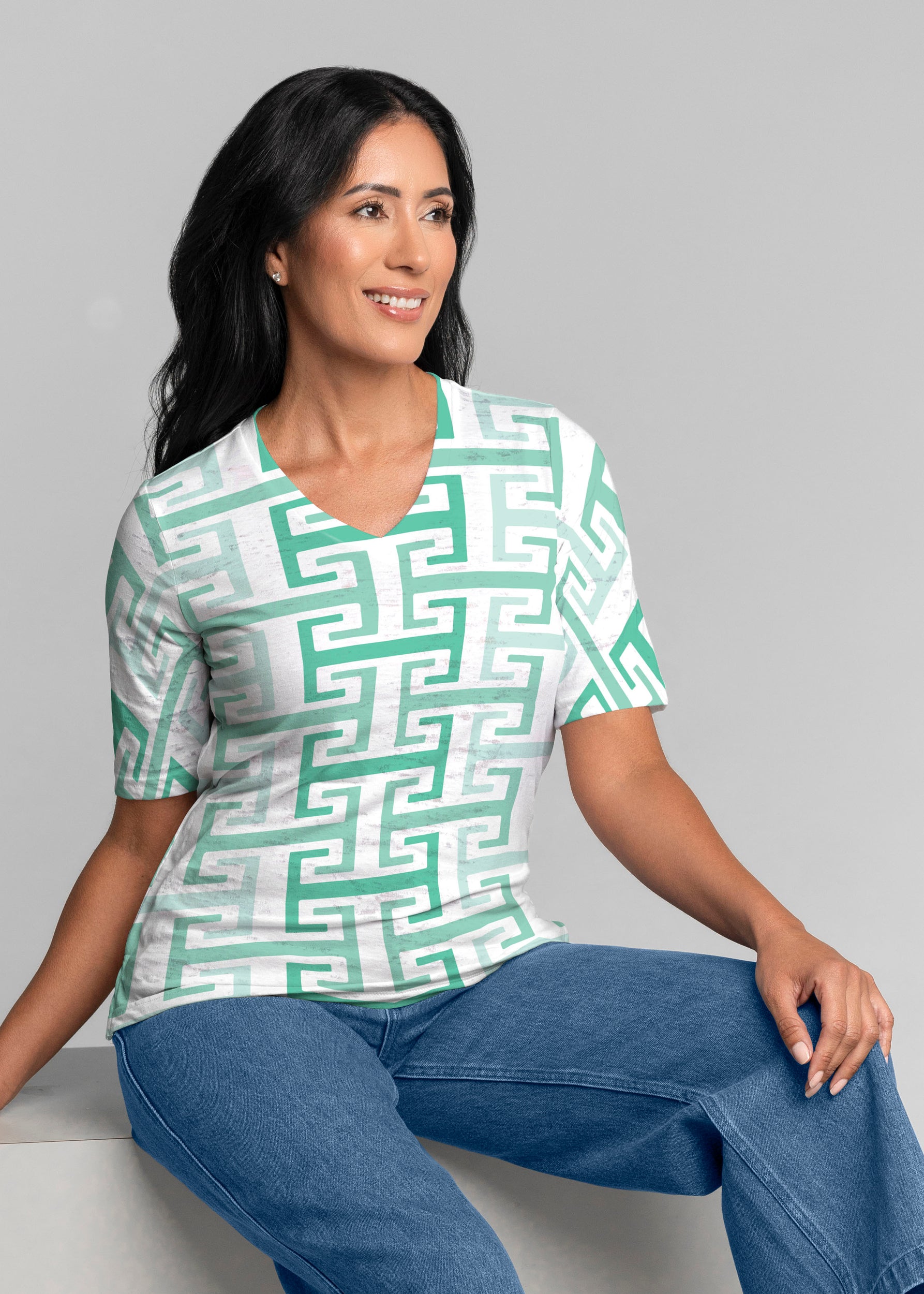 • Greek Key Mint (8193) ~ Signature Elbow Sleeve V-Neck Top