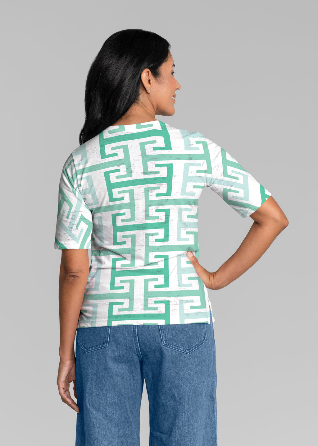 Greek Key Mint (8193) ~ Signature Elbow Sleeve V-Neck Top