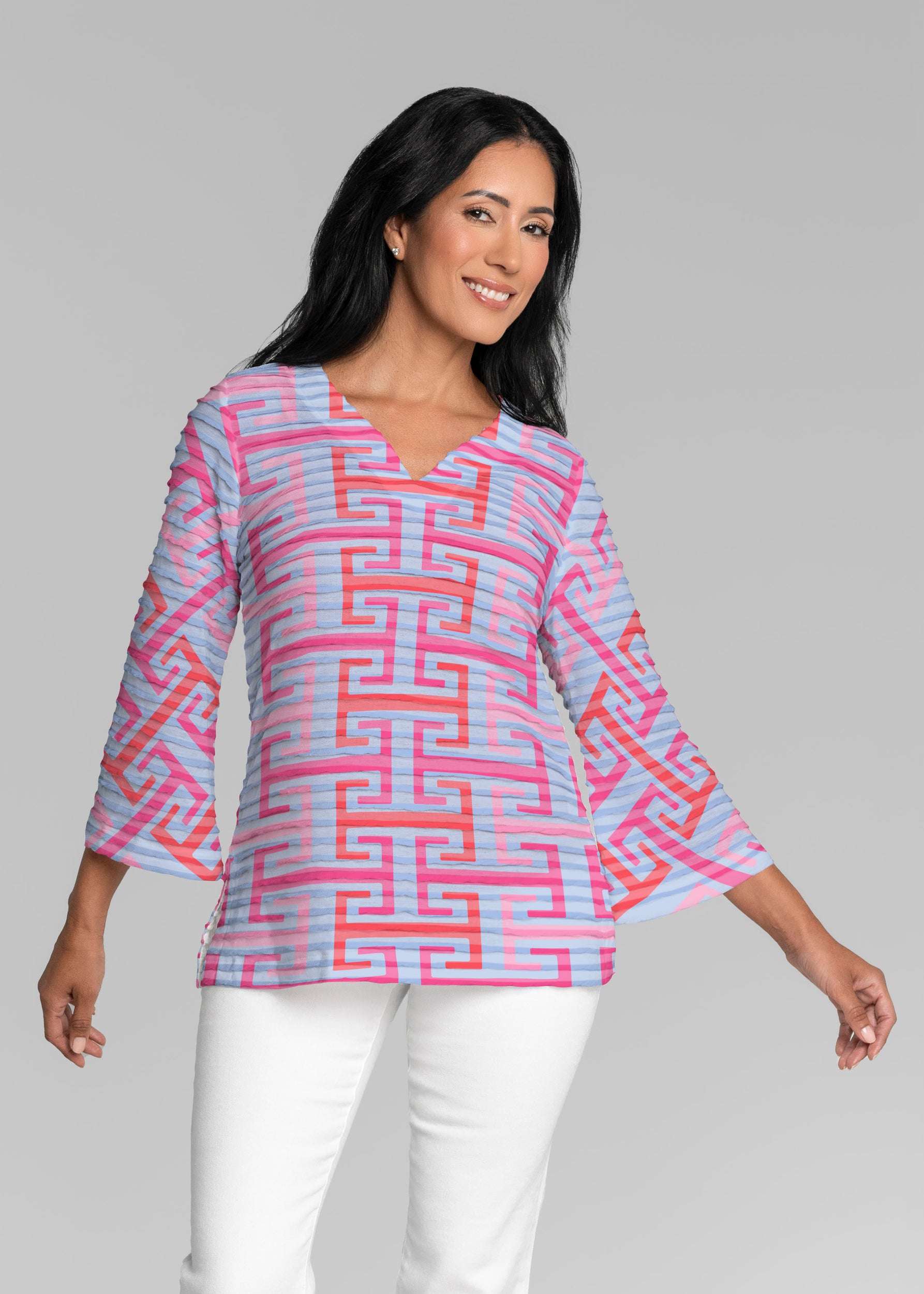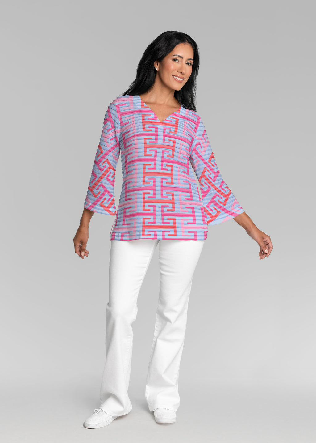 Greek Key Summer (7414) ~ Banded 3/4 Bell-Sleeve V-Neck Tunic