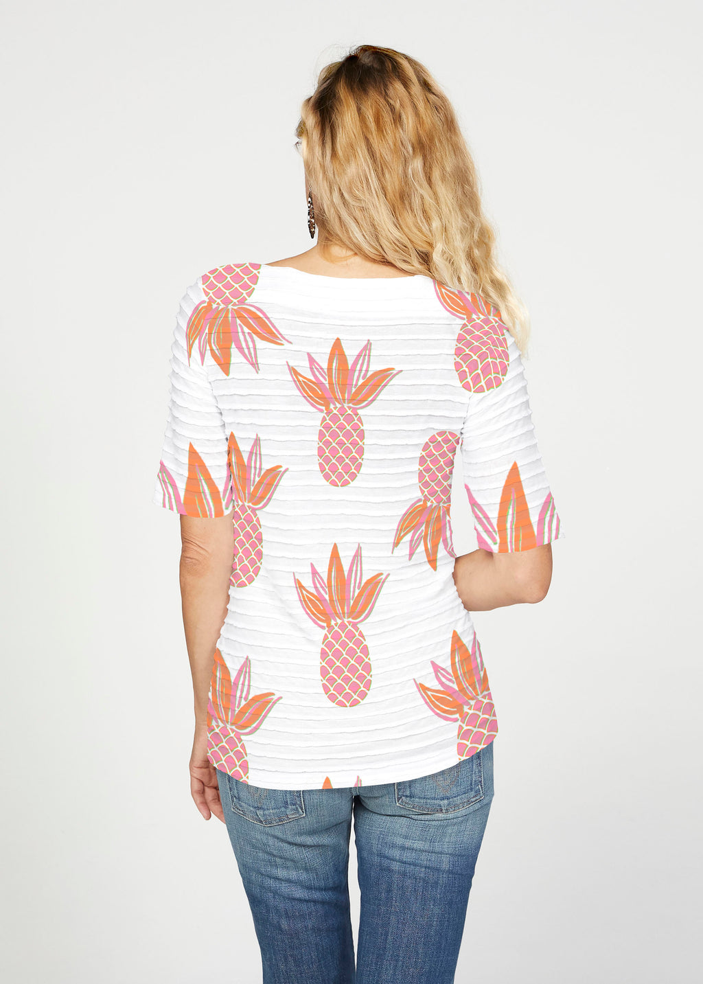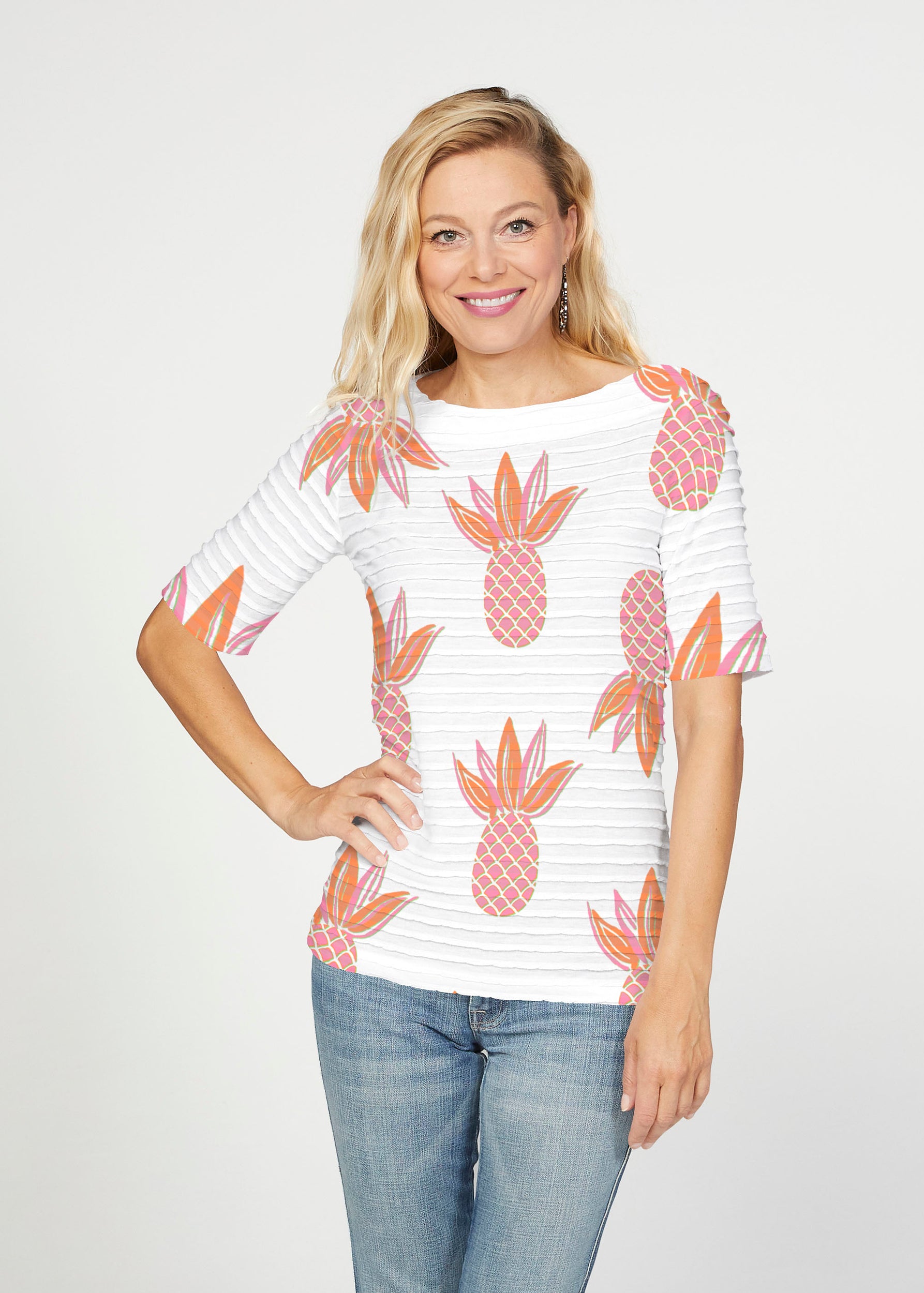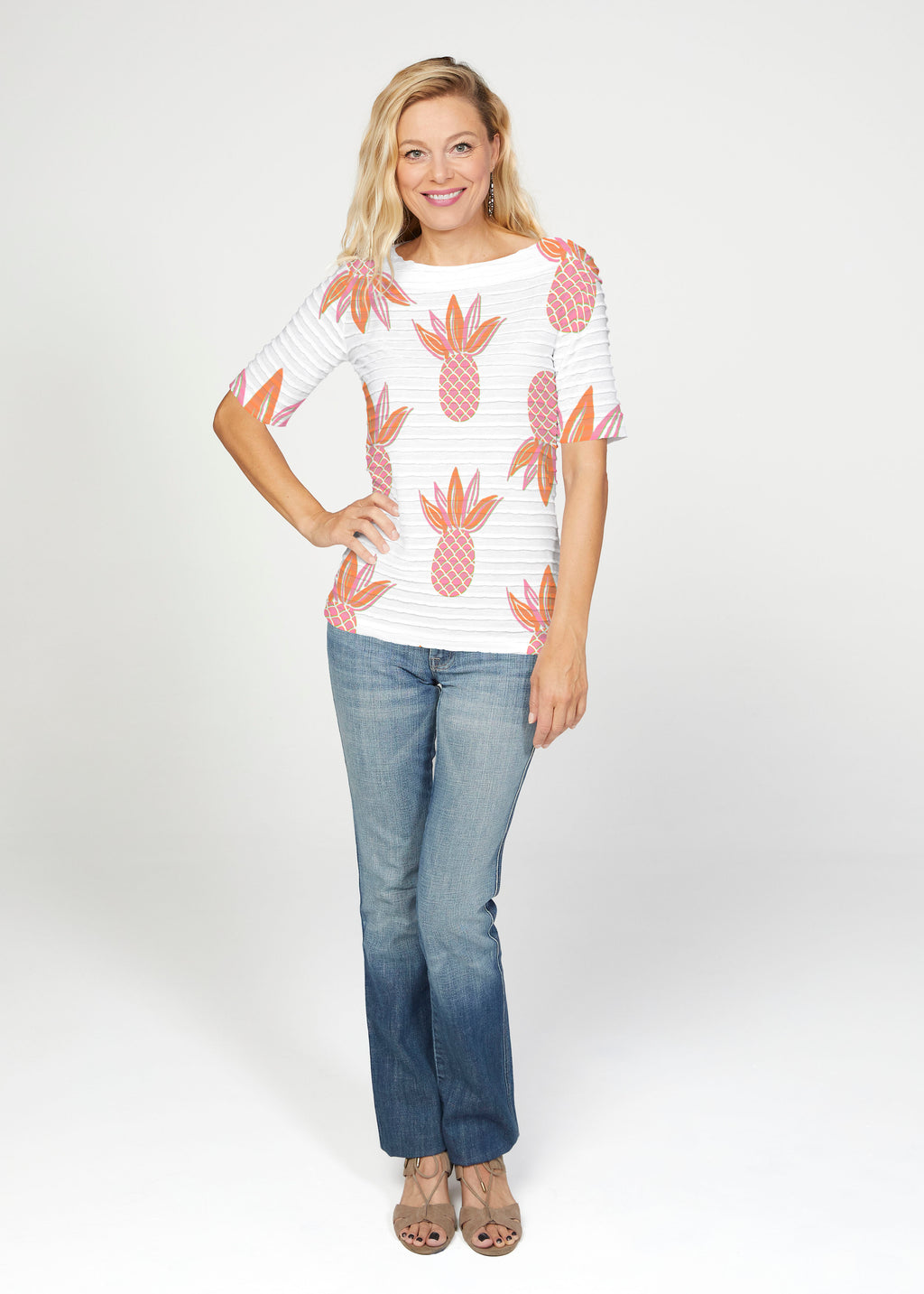 The uniquely soft, pleated texture in this Banded fabric gives the elbow sleeve and boat neck top a fun and sophisticated look. Easy relaxed fit with a hemline that comes below the hip.