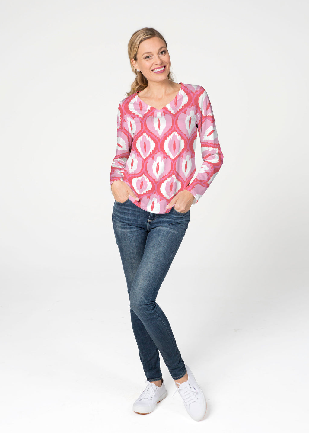 Ikat Buds Red/Pink (8096) ~ Butterknit Long Sleeve V-Neck Top