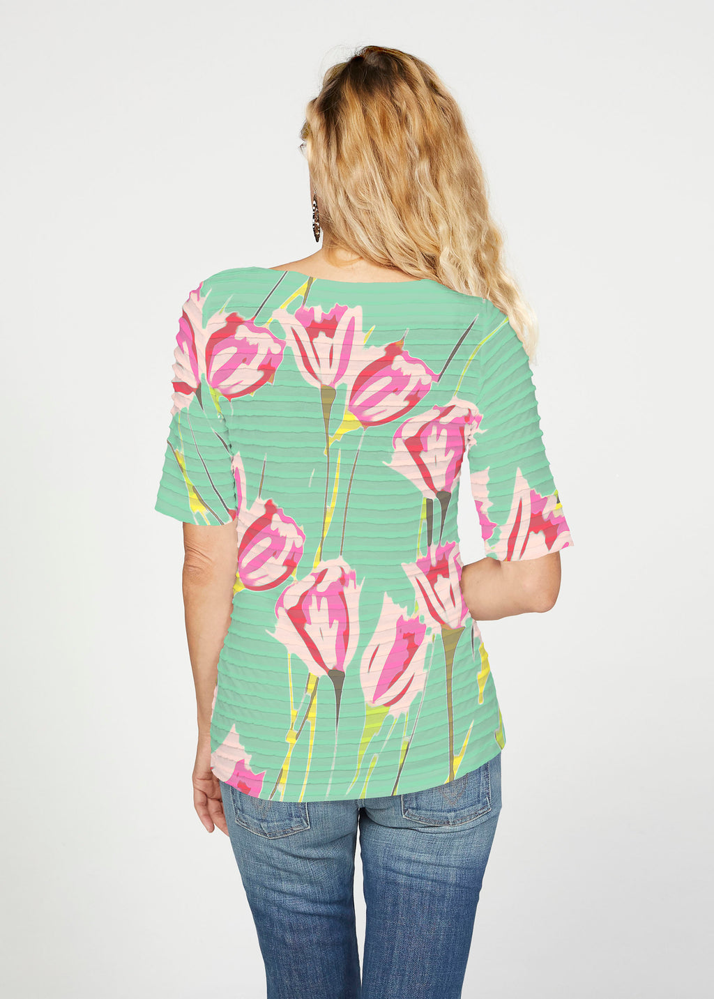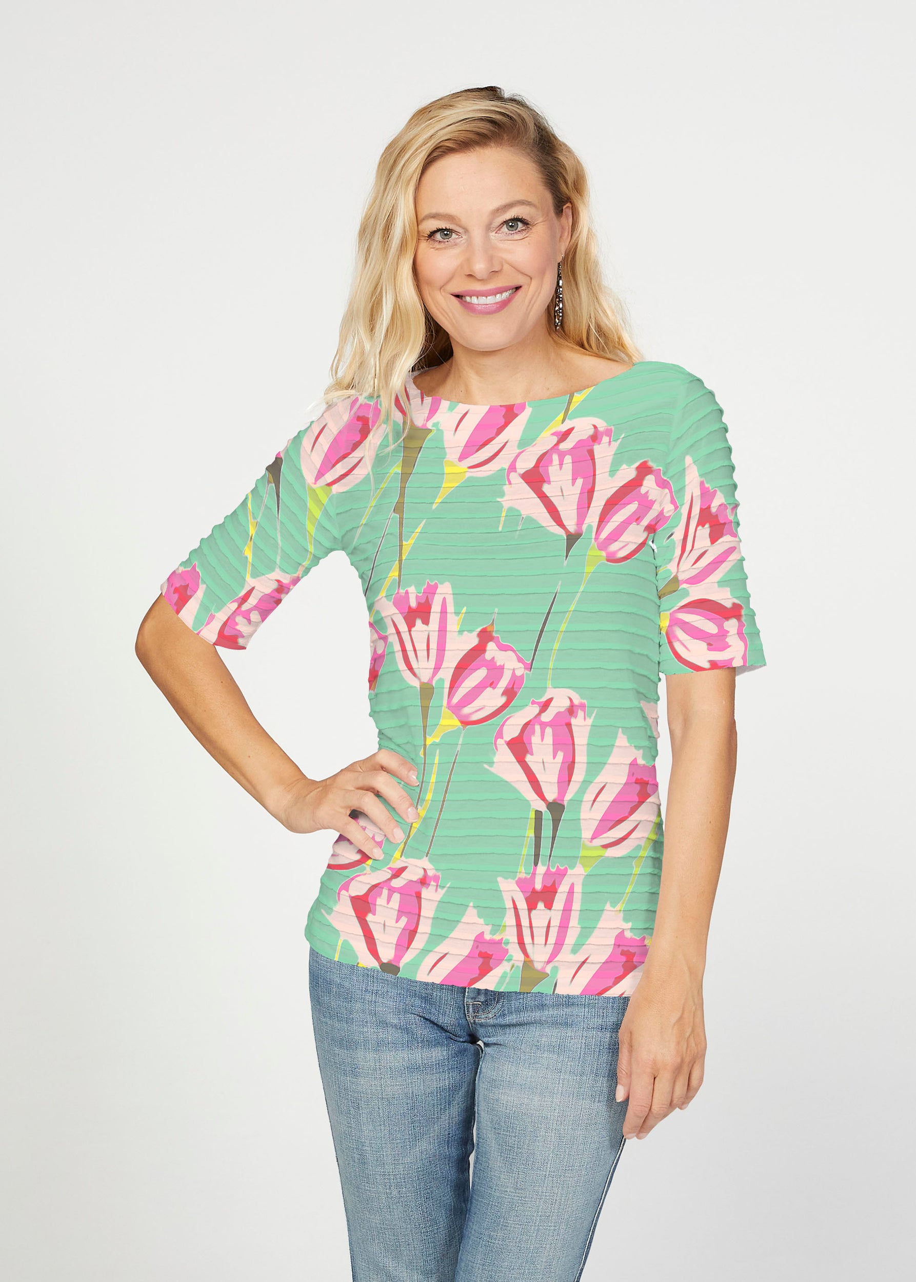 The uniquely soft, pleated texture in this Banded fabric gives the elbow sleeve and boat neck top a fun and sophisticated look. Easy relaxed fit with a hemline that comes below the hip.