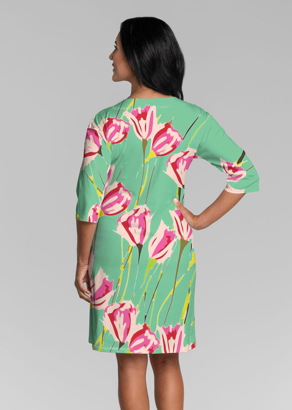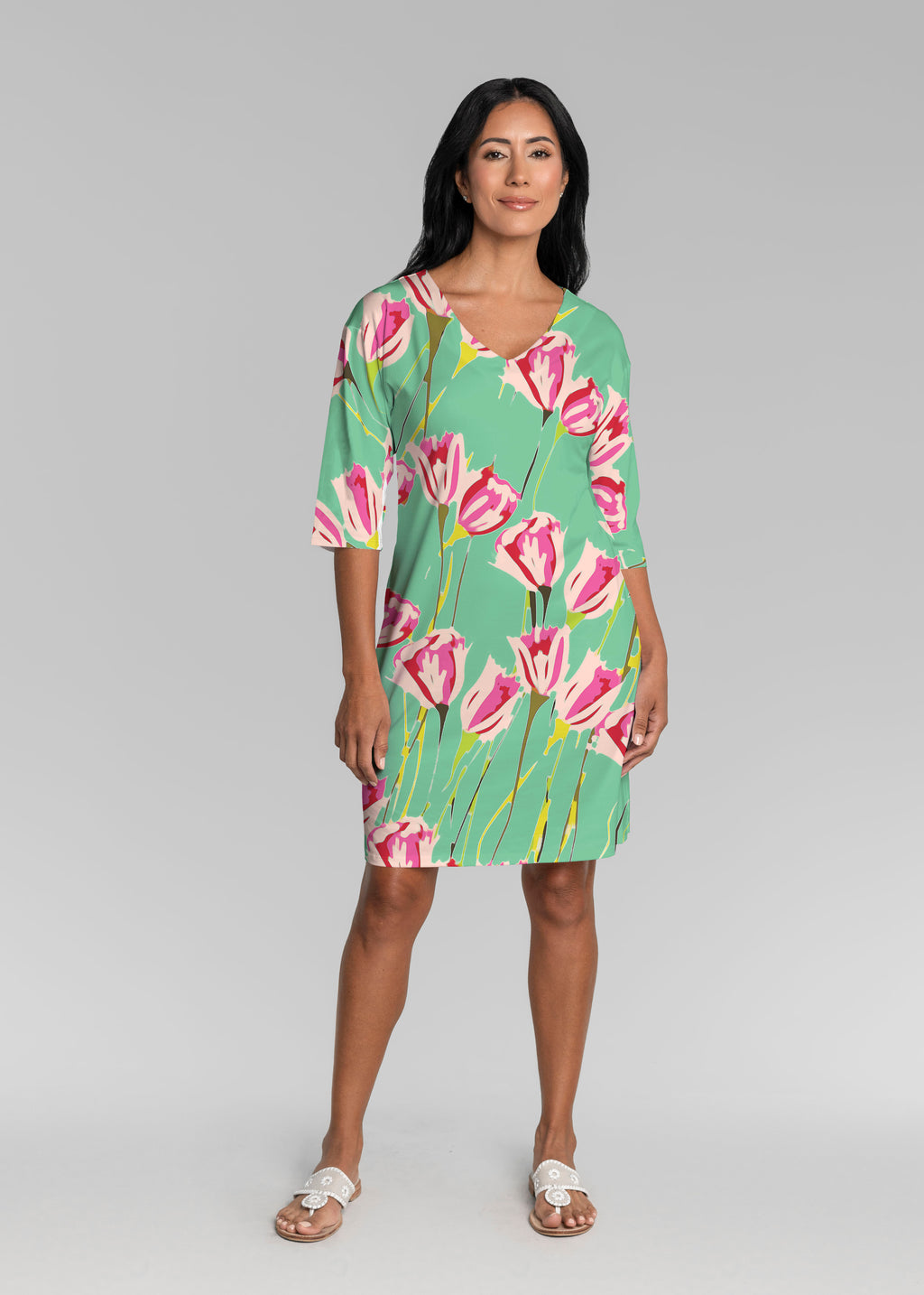 Be comfortable and fashionable all day in our soft Lucy fabric. This v-neck dress features loose 3/4 sleeves, drop shoulders and falls just at the knee.
