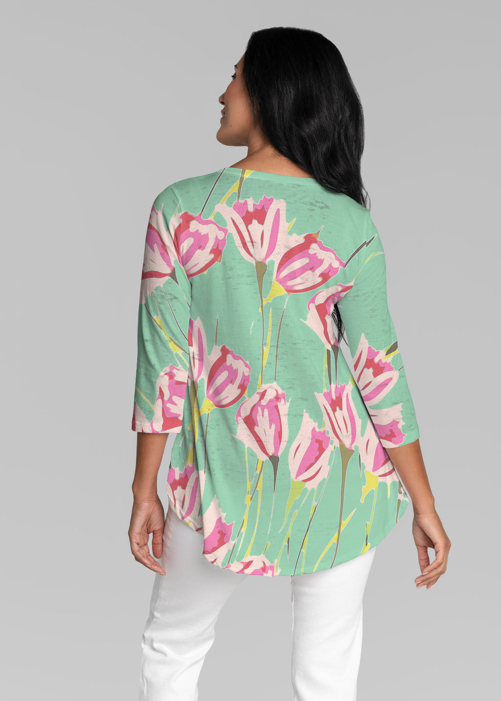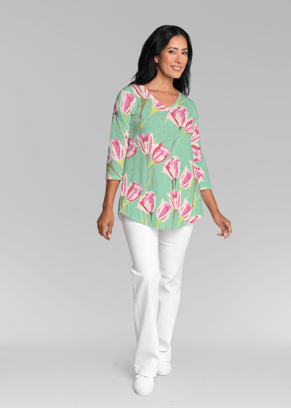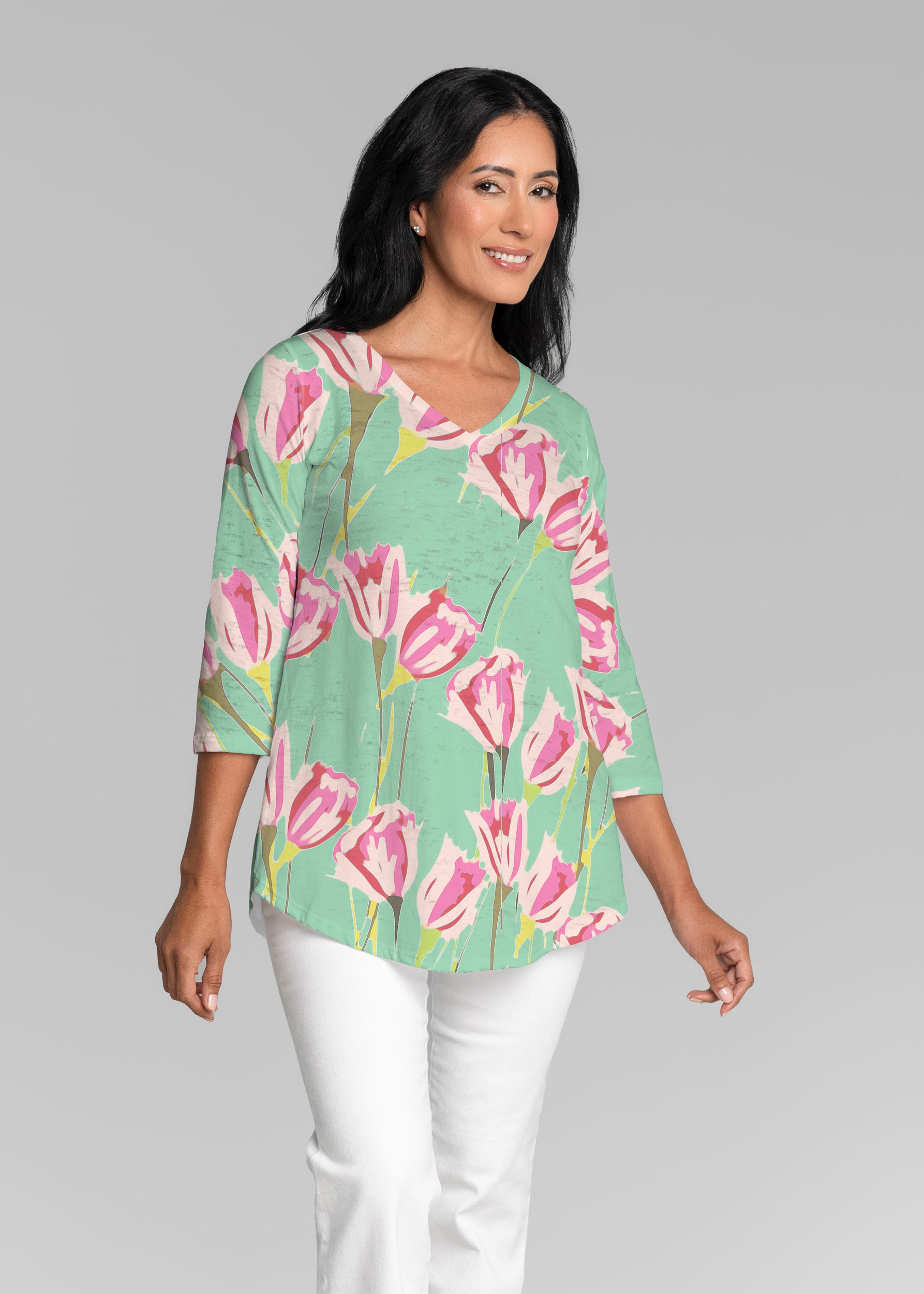 This v-neck tunic in our Signature burnout fabric is forever flattering. 3/4 sleeves and a v-neck flow into a full, swinging shirttail hem.