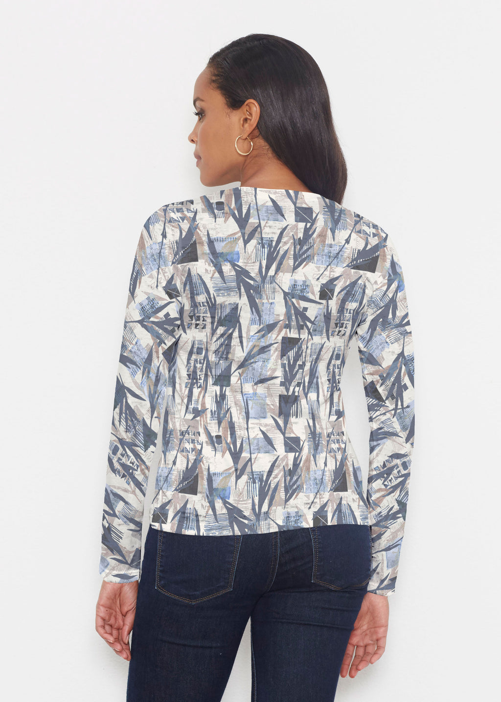 A detailed mixed neutral print with leaves and geometric watercolor painted motifs. Designed by Susan Werner.