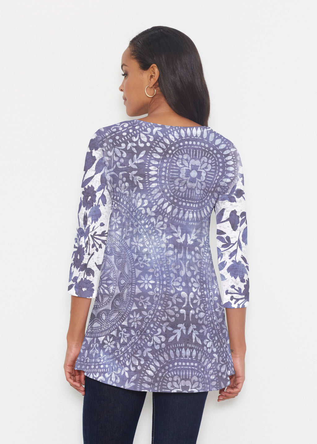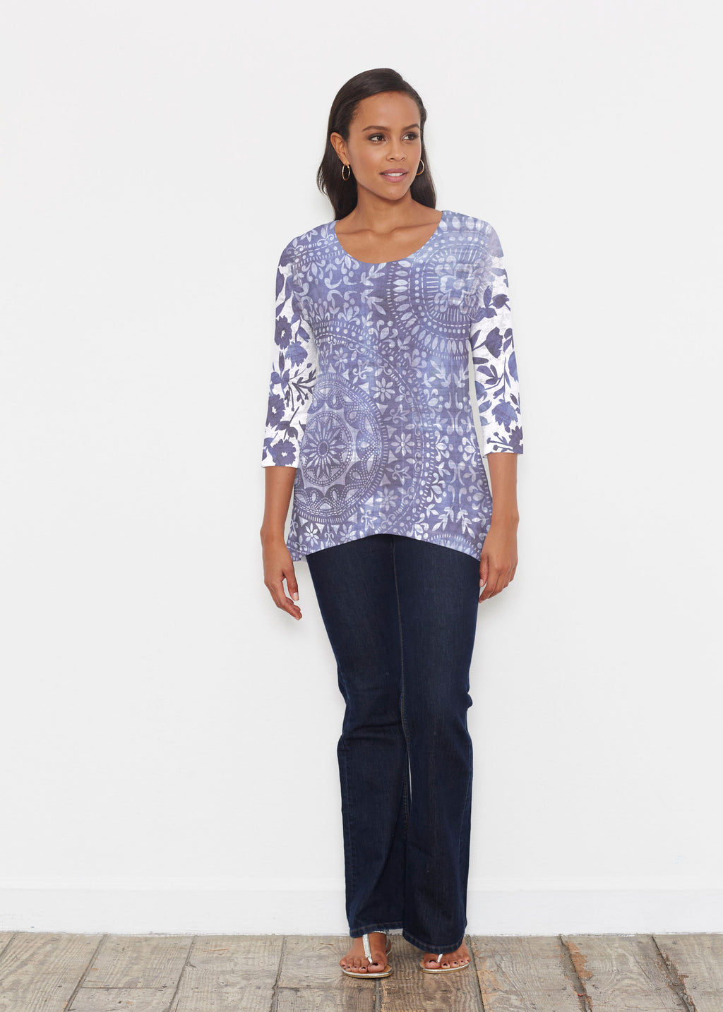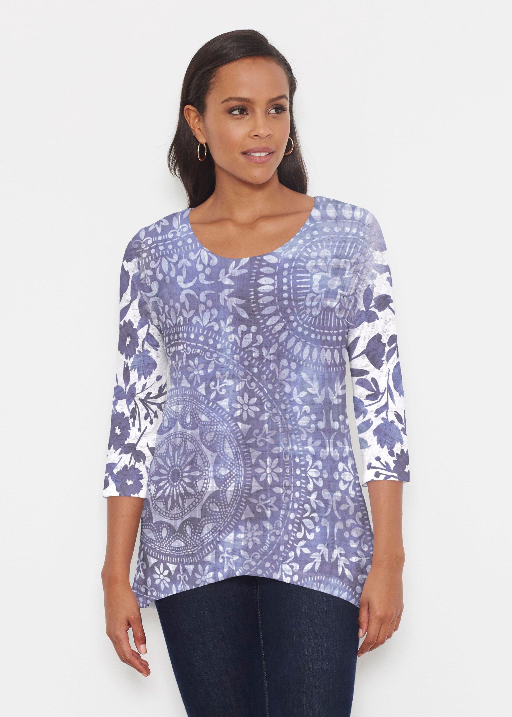 Striking geometric print in blue and white with contrasting floral print on sleeves. Designed by Diane Kappa.