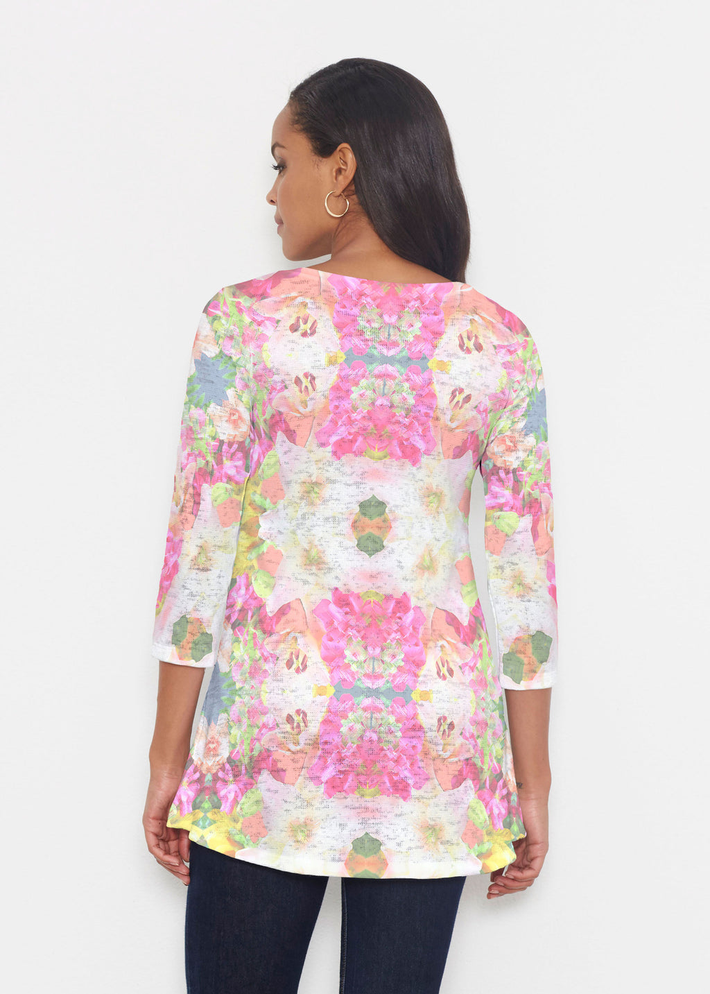 An elegant fit, the hemline falls higher in front then cascades beautifully down across back. Delicate scoop neckline and 3/4 sleeves made in our soft Baby Waffle burnout thermal blend.