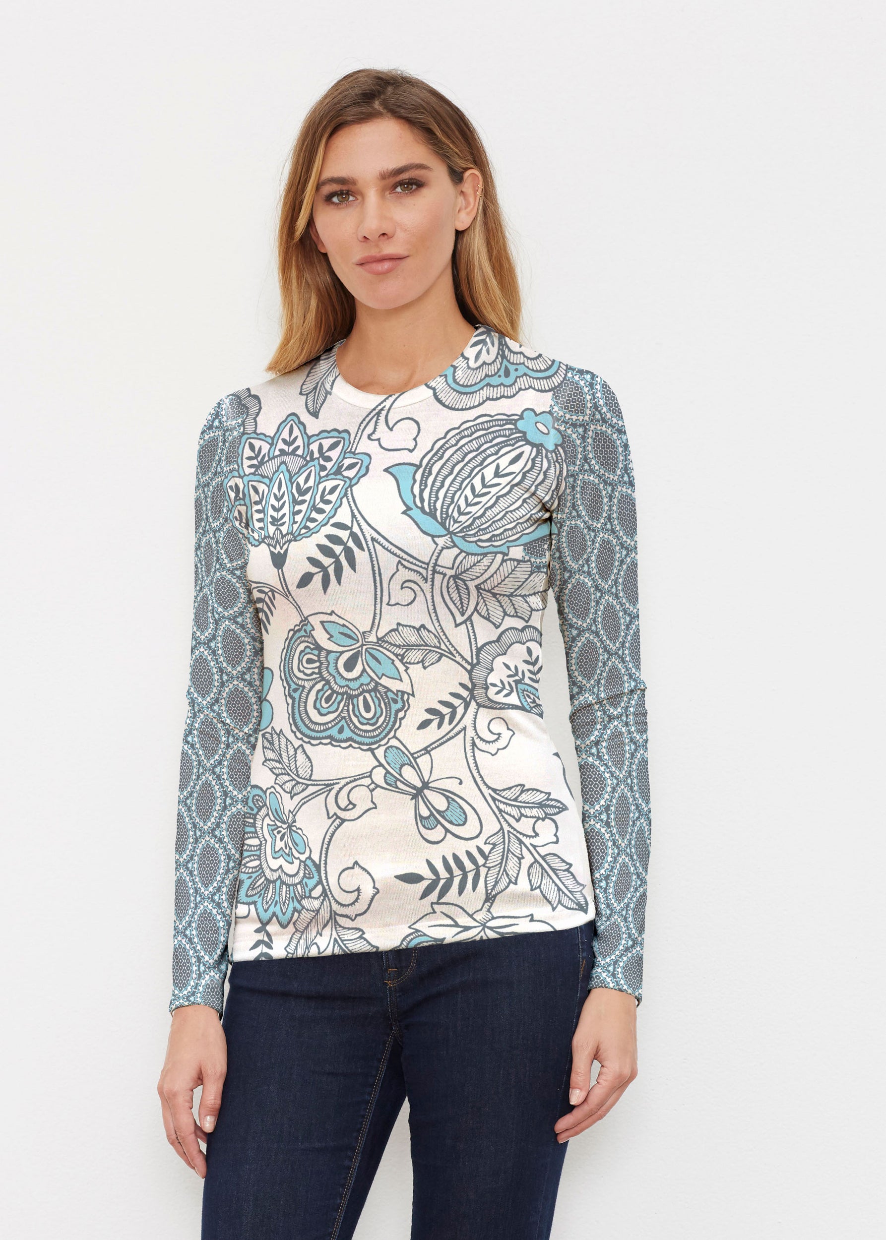 Beautiful floral print in navy and aqua with contrasting sleeves designed by Diane Kappa.