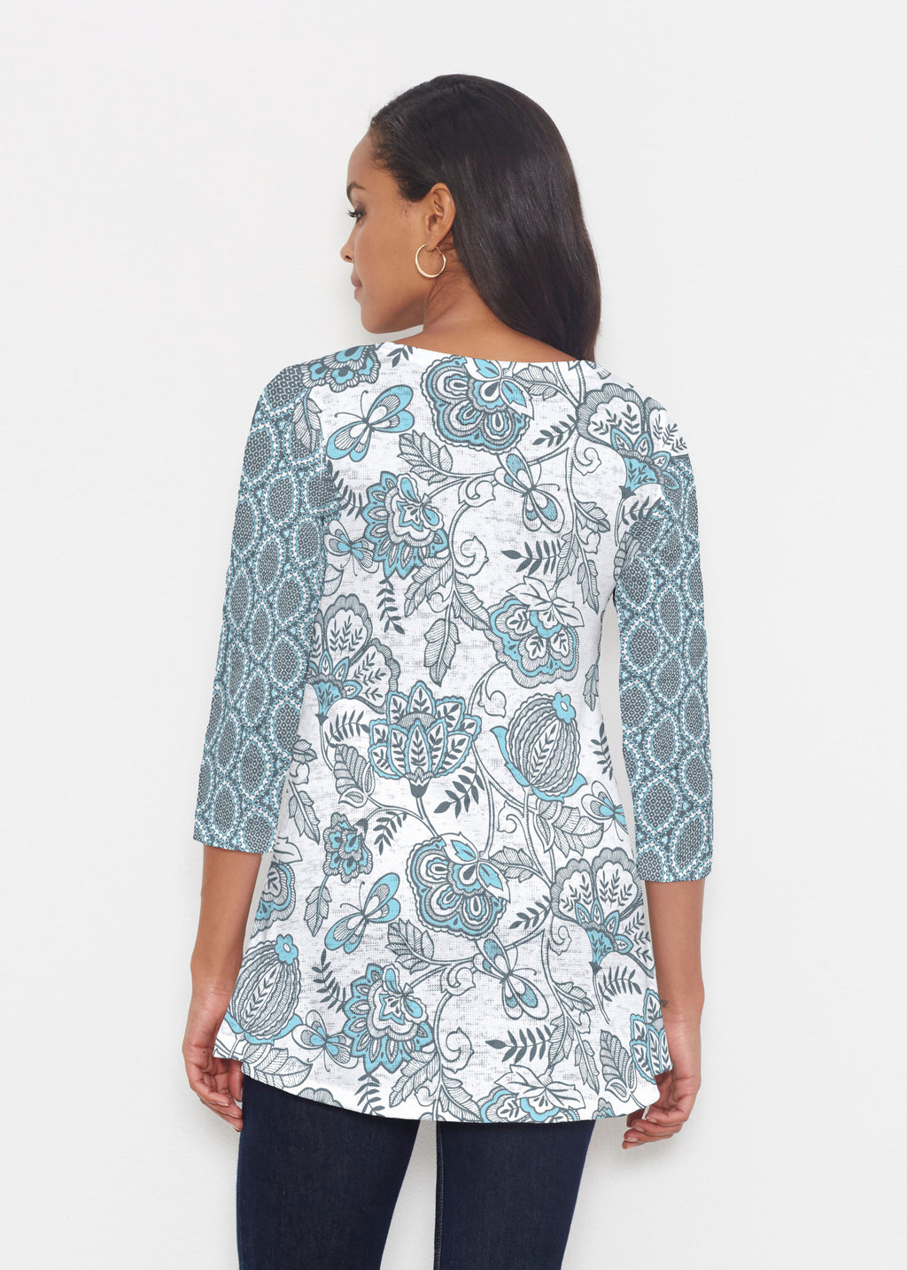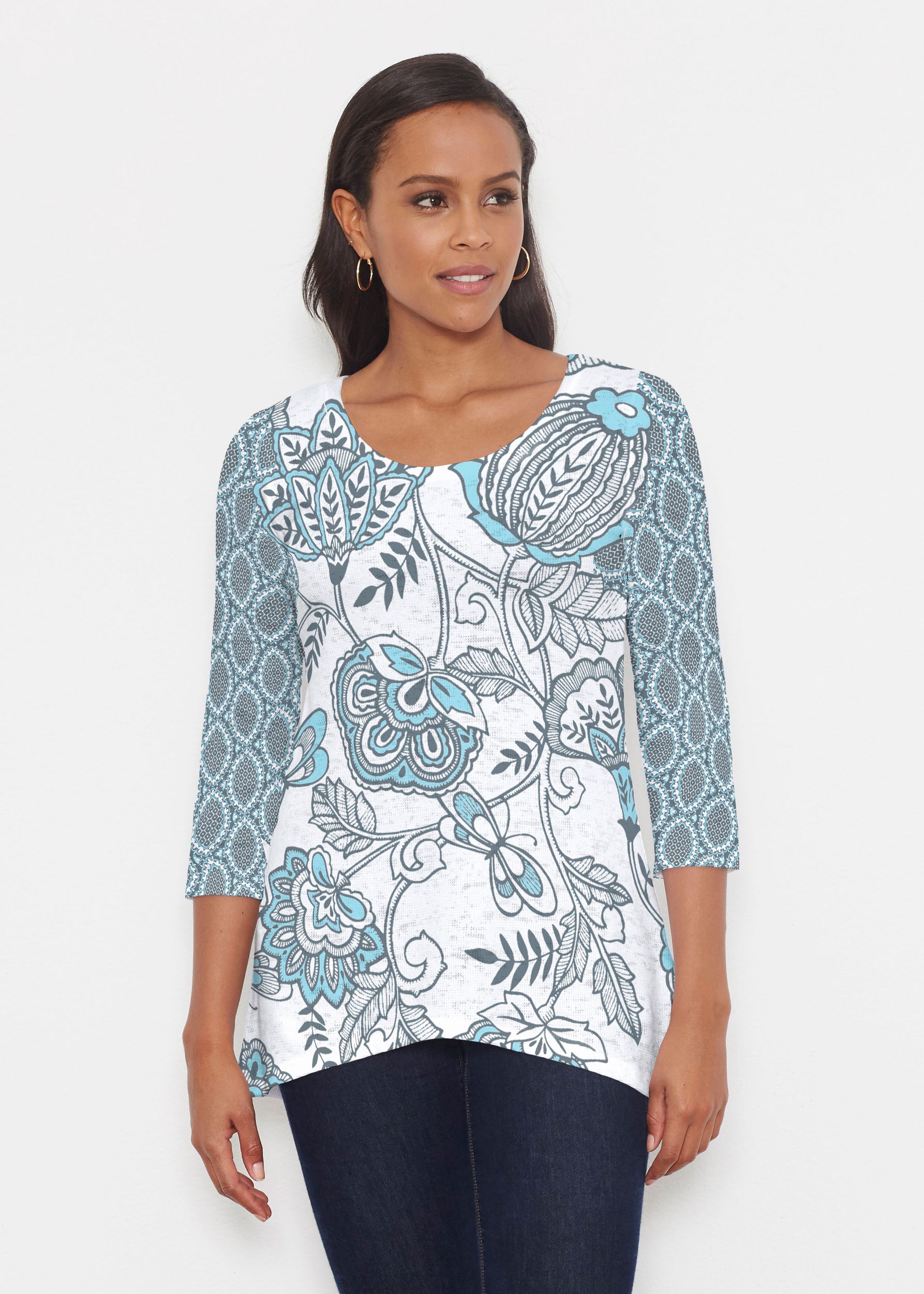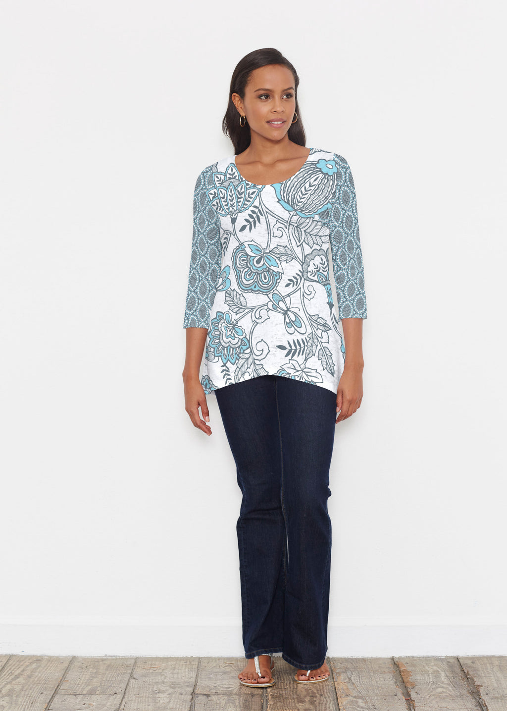 Beautiful floral print in navy and aqua with contrasting sleeves designed by Diane Kappa.