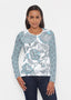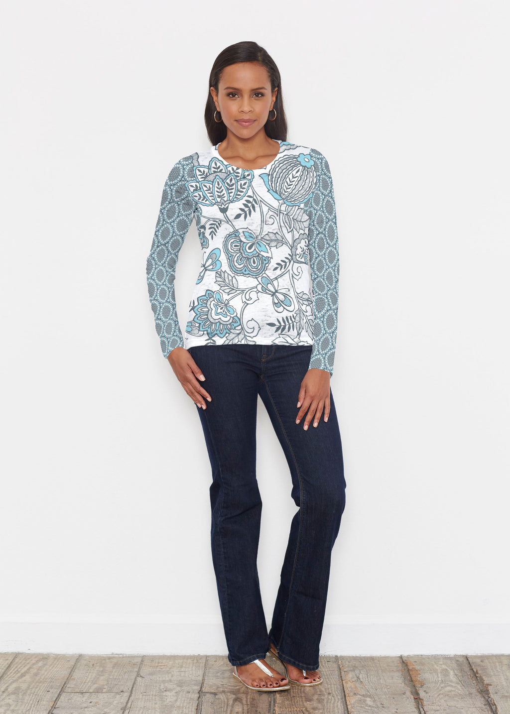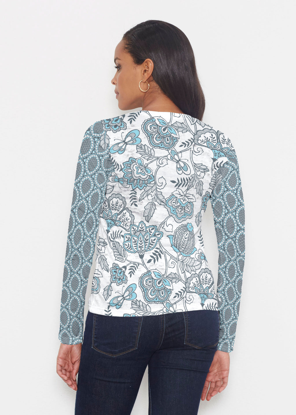 Beautiful floral print in navy and aqua with contrasting sleeves designed by Diane Kappa.