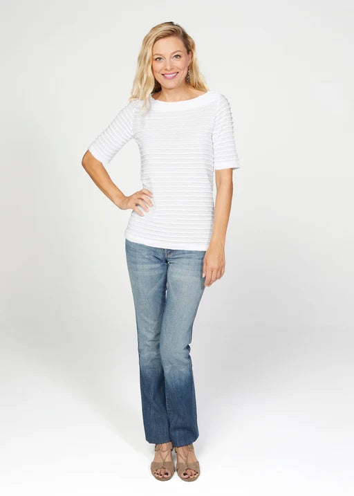 The uniquely soft, pleated texture in this Banded fabric gives the elbow sleeve and boat neck top a fun and sophisticated look. Easy relaxed fit with a hemline that comes below the hip.