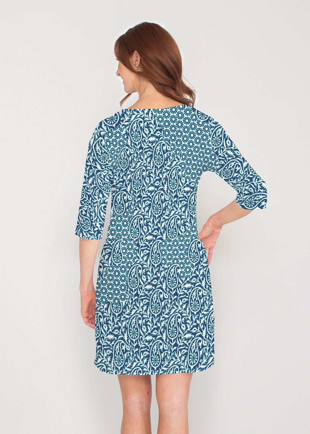 Be comfortable and fashionable all day in our soft Lucy fabric. This v-neck dress features loose 3/4 sleeves, drop shoulders and falls just at the knee.