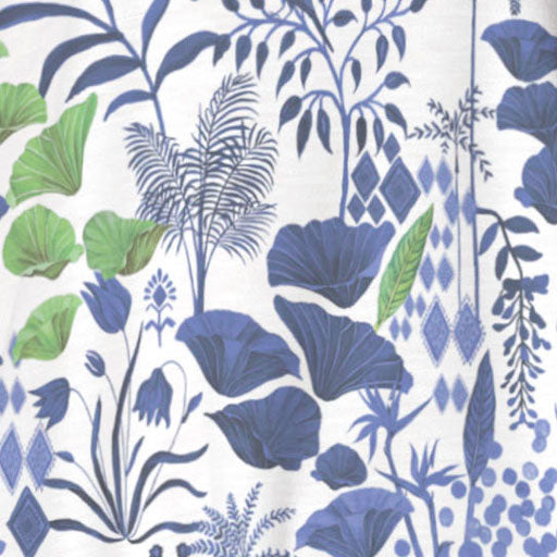 Print design is reminiscent of a beautiful floral garden, featuring bold blue flowers against a clean white canvas, with just a dash of orange to add a pop of color for a a playful and energetic element making a stylish garden party statement.