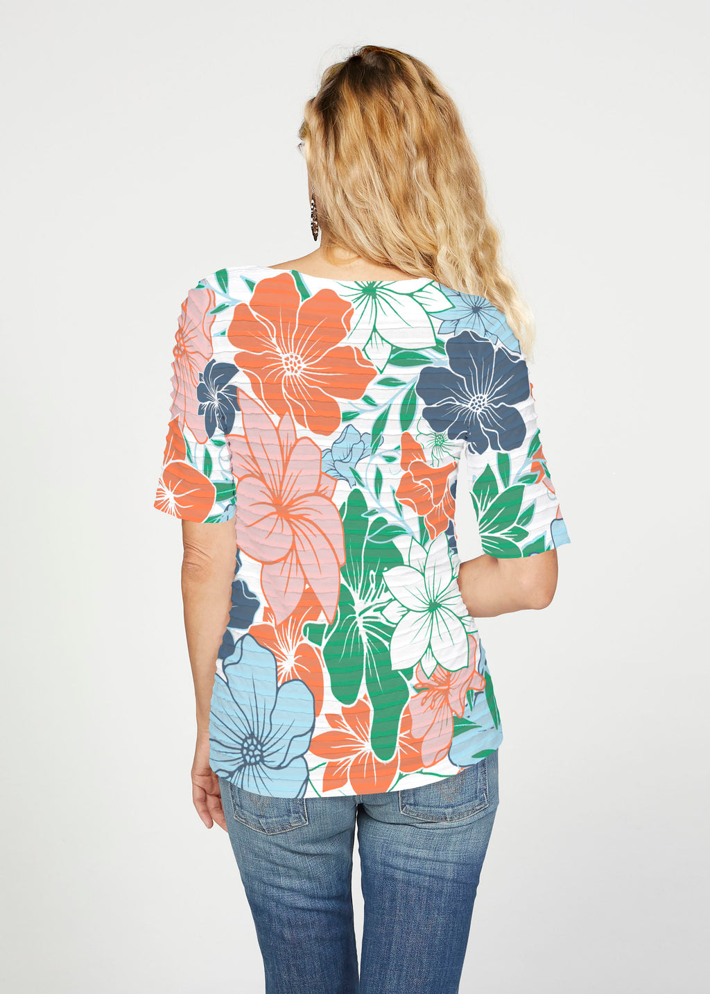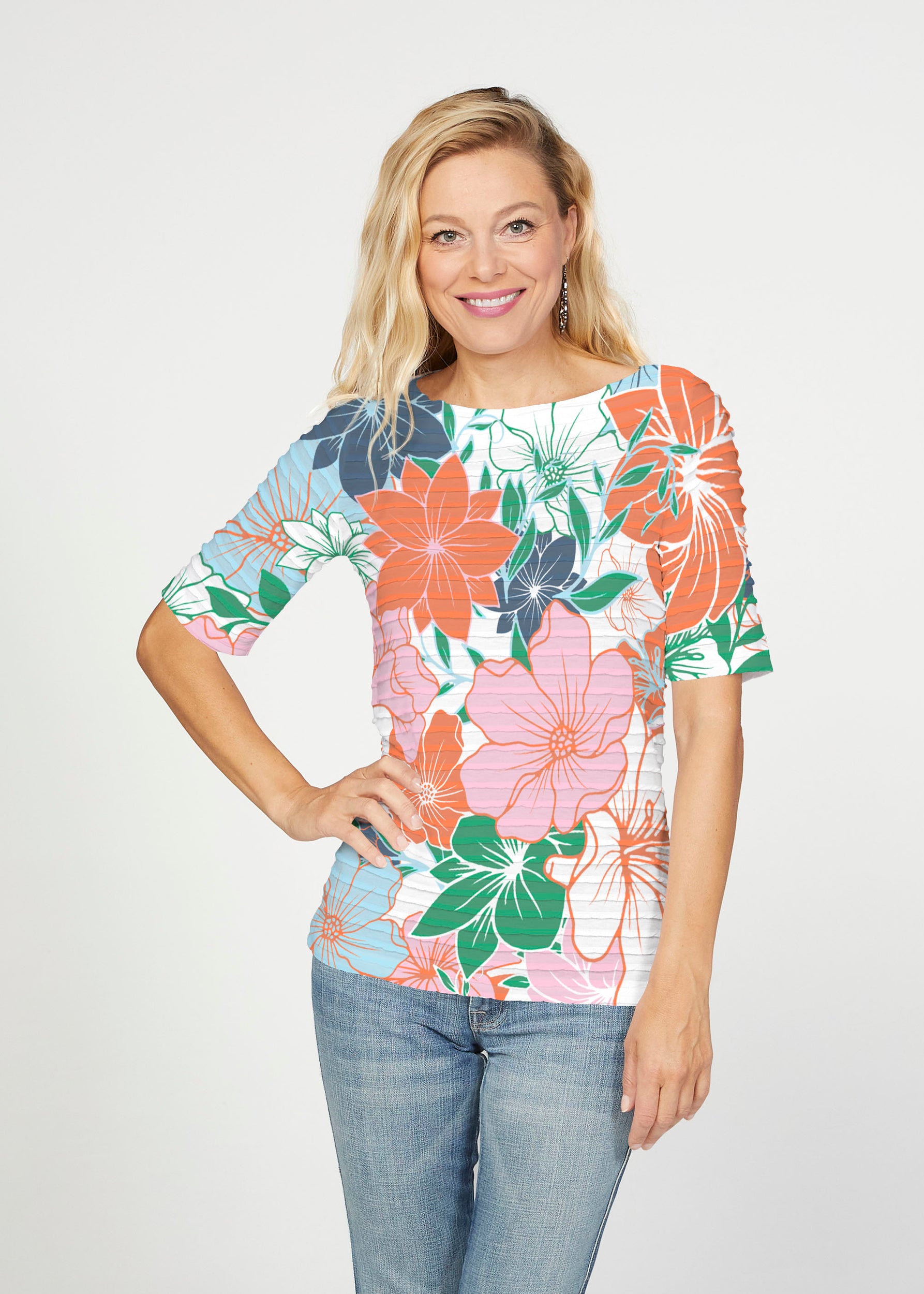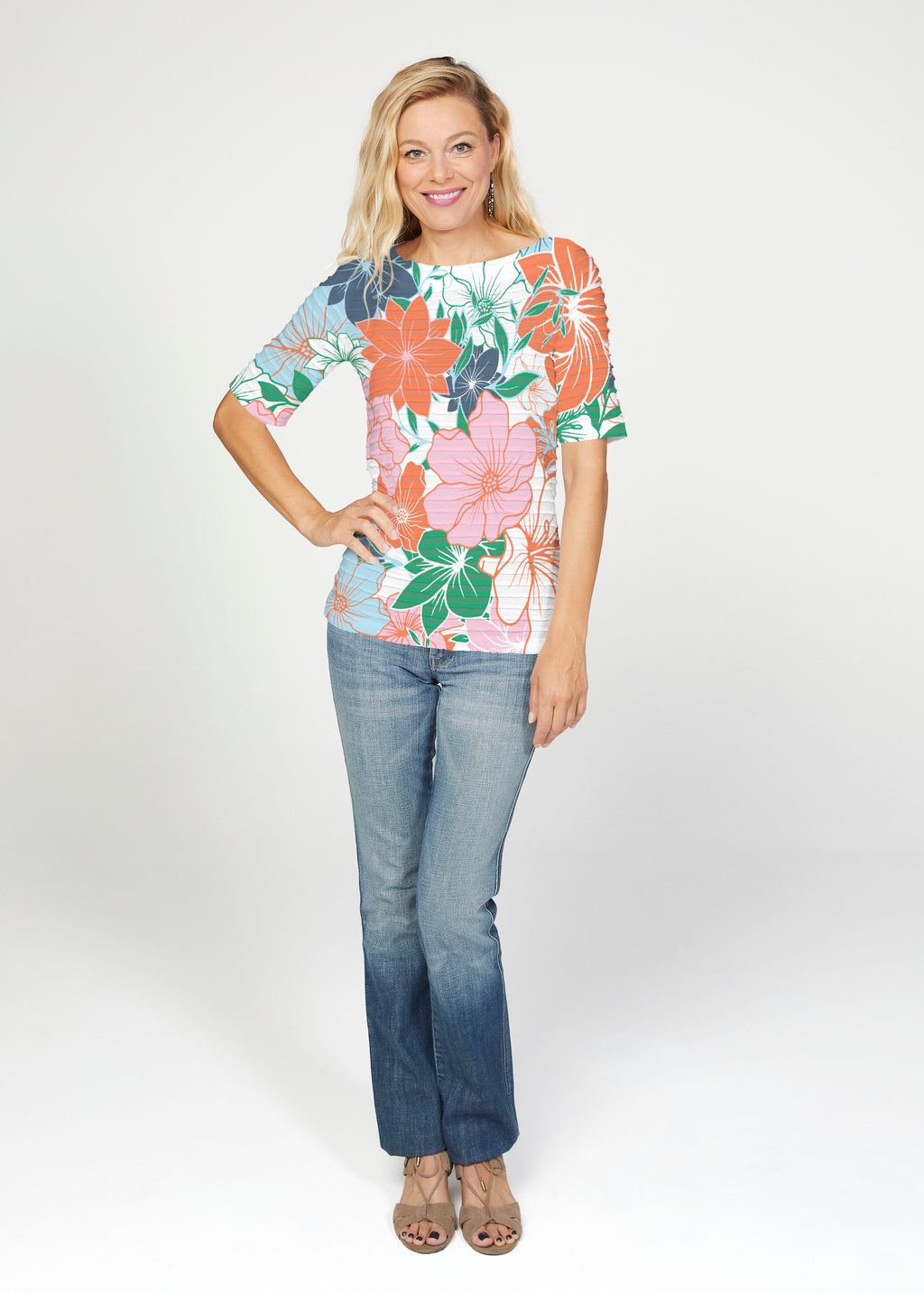The uniquely soft, pleated texture in this Banded fabric gives the elbow sleeve and boat neck top a fun and sophisticated look. Easy relaxed fit with a hemline that comes below the hip.