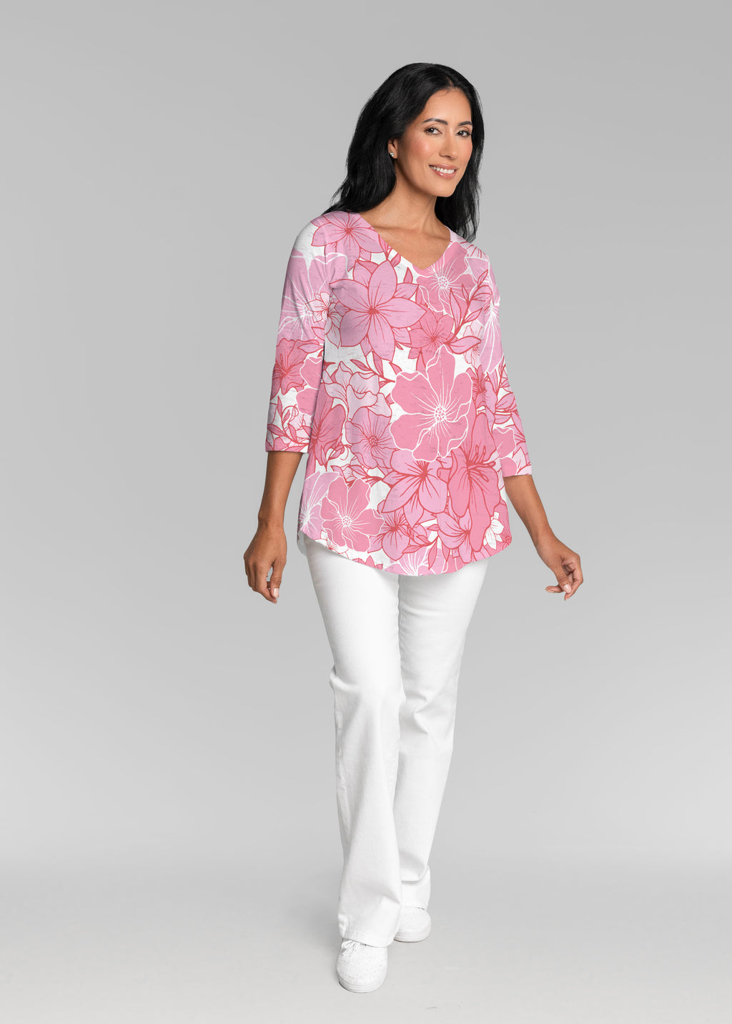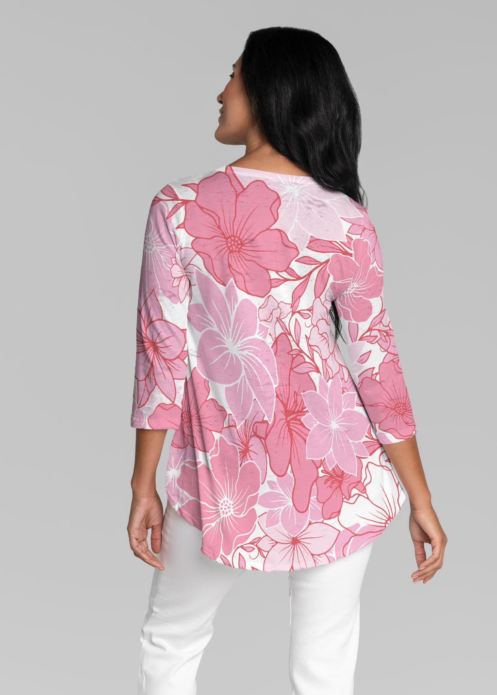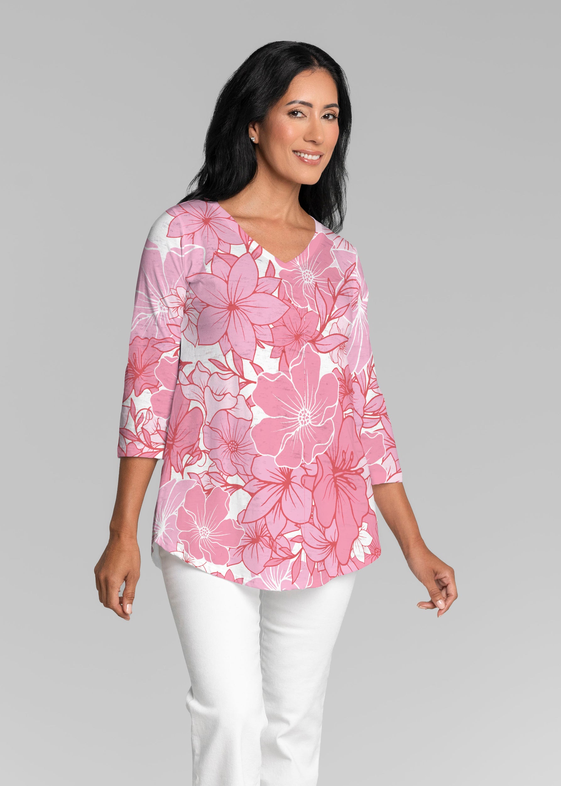 This v-neck tunic in our Signature burnout fabric is forever flattering. 3/4 sleeves and a v-neck flow into a full, swinging shirttail hem.