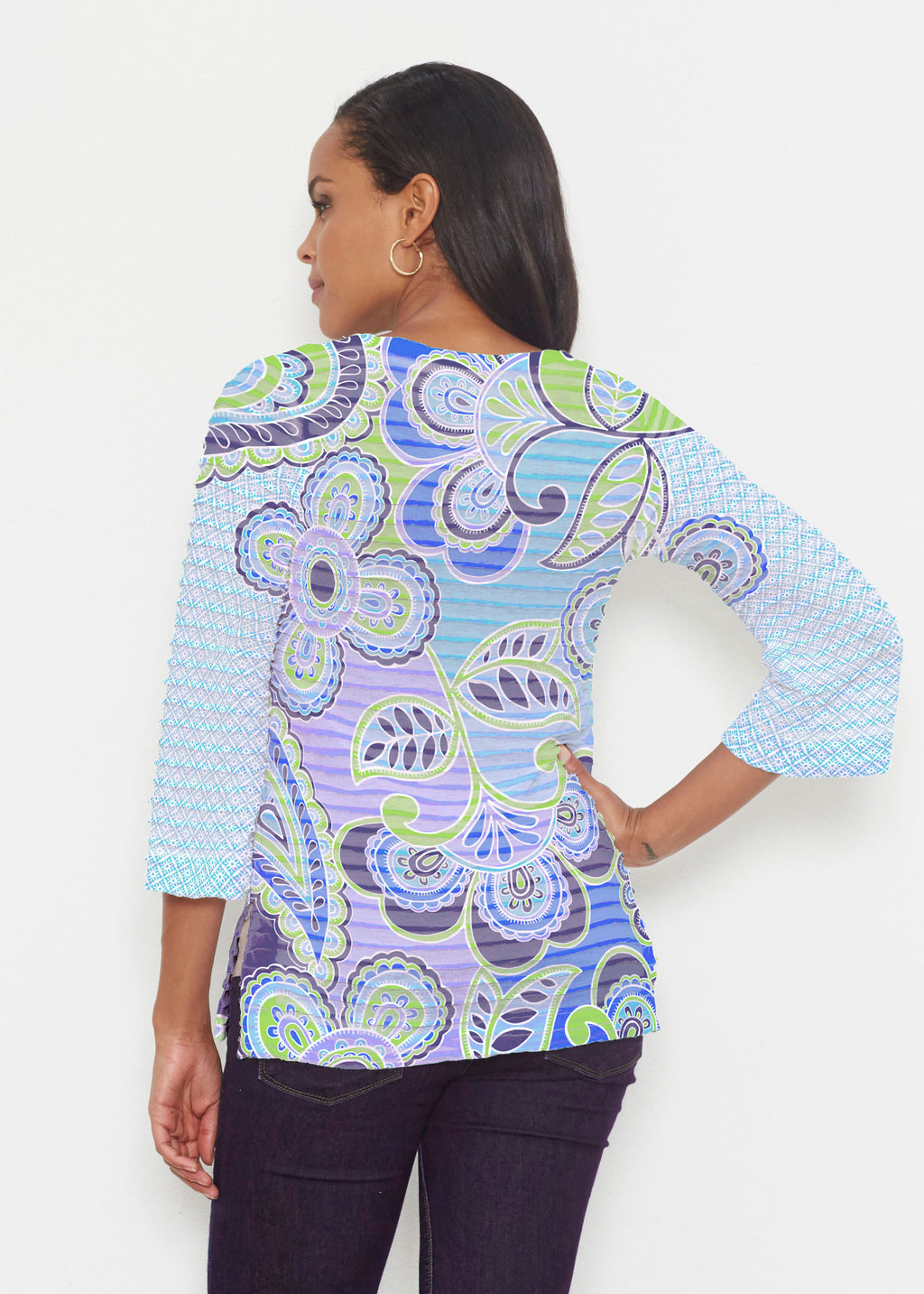 Fanciful blue, lime and turquoise print with contrasting front and back print designed by Diane Kappa.