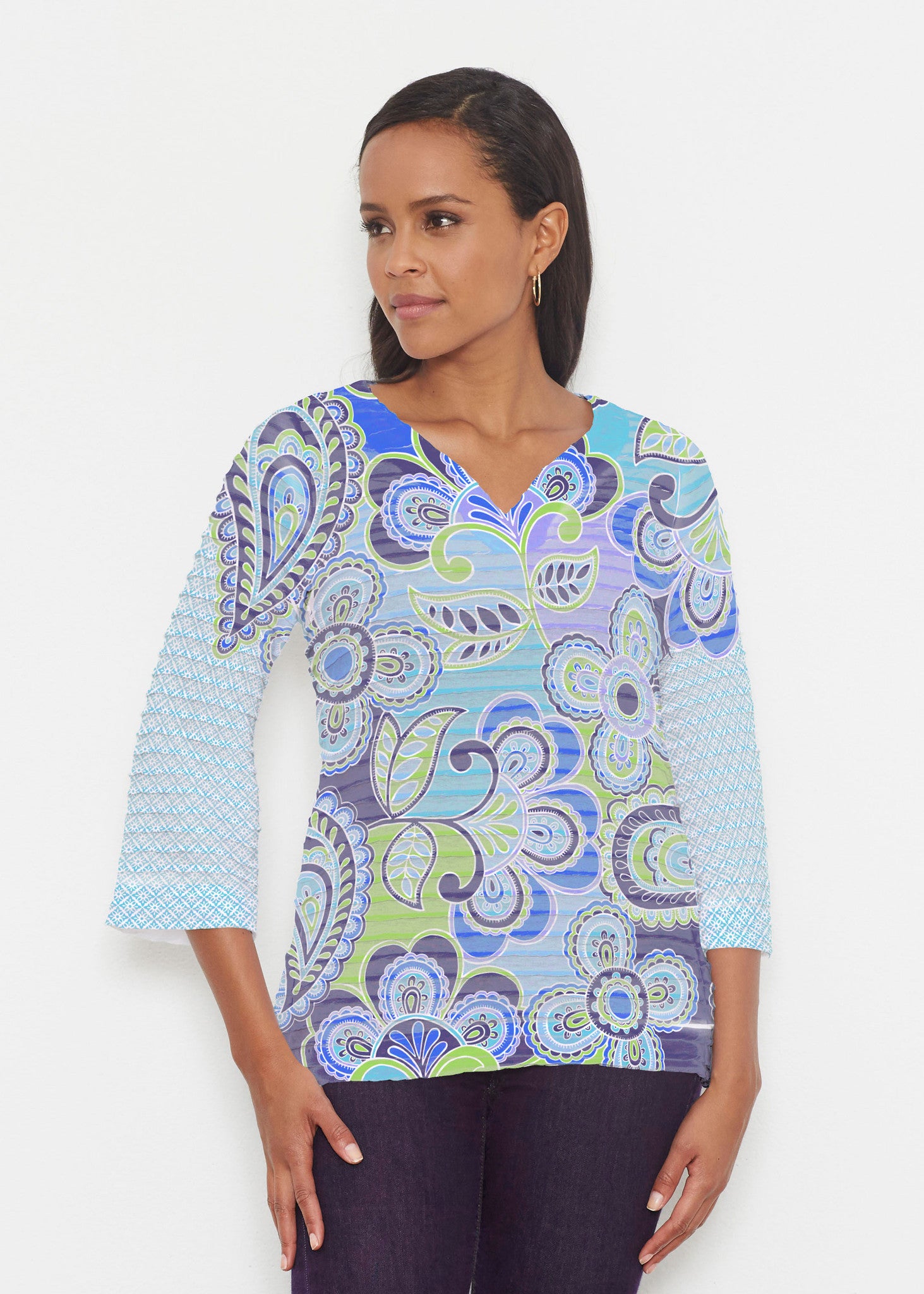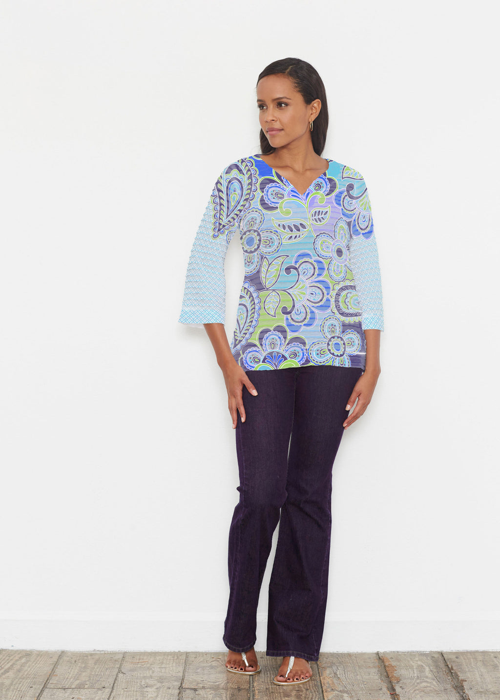 The uniquely soft, pleated texture in this Banded fabric give the 3/4 bell sleeves and sweetheart v-neck a fun and sophisticated look. Flattering side vents adorn the hemline that skims the hip.