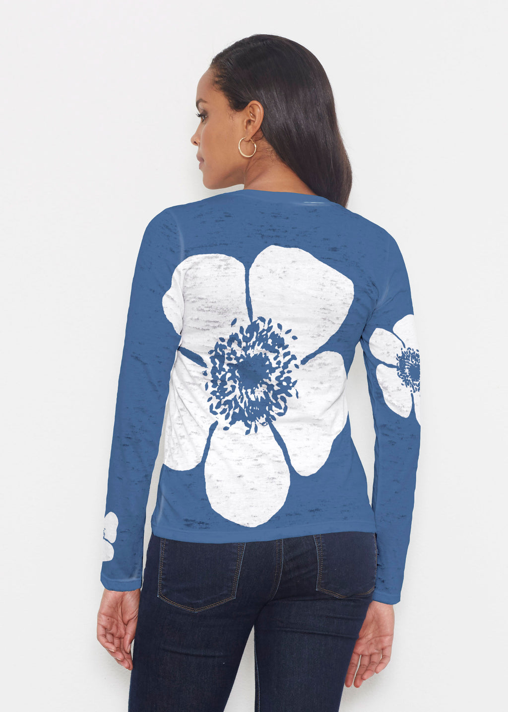 This print features small poppies on the front with a large poppy on back in navy and white. This classic favorite designed by Susan Werner.