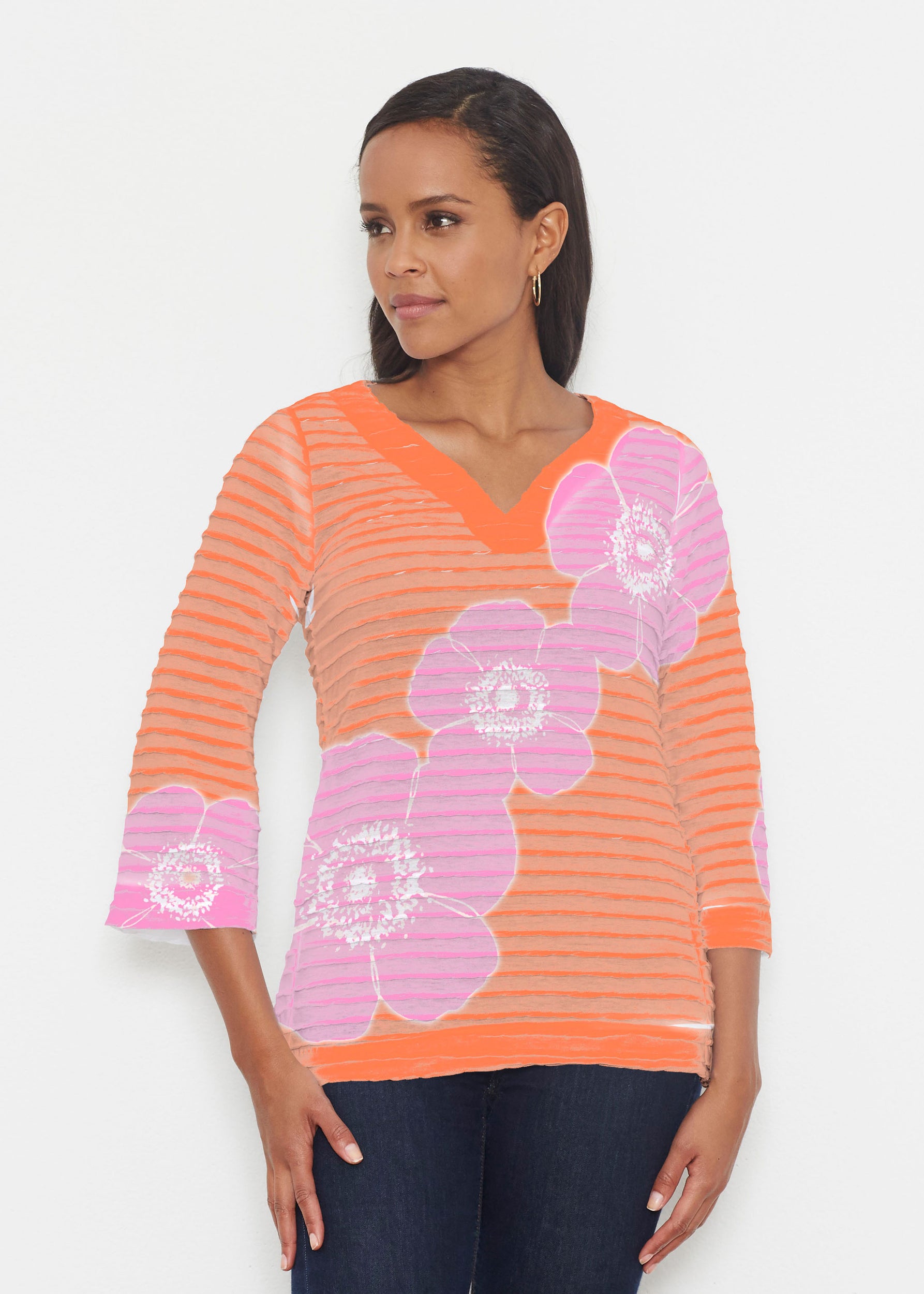 The uniquely soft, pleated texture in this Banded fabric give the 3/4 bell sleeves and sweetheart v-neck a fun and sophisticated look. Flattering side vents adorn the hemline that skims the hip.